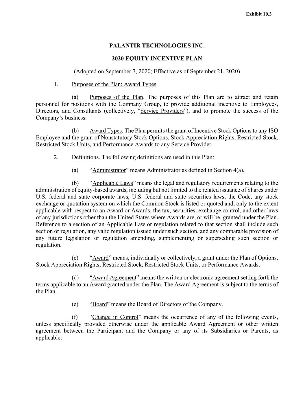 PALANTIR TECHNOLOGIES INC. 2020 EQUITY INCENTIVE PLAN (Adopted on September 7, 2020; Effective as of September 21, 2020) 1. Purposes of the Plan; Award Types. (a) Purposes of the Plan. The purposes of this Plan are to attract and retain personnel for positions with the Company Group, to provide additional incentive to Employees, Directors, and Consultants (collectively, “Service Providers”), and to promote the success of the Company’s business. (b) Award Types. The Plan permits the grant of Incentive Stock Options to any ISO Employee and the grant of Nonstatutory Stock Options, Stock Appreciation Rights, Restricted Stock, Restricted Stock Units, and Performance Awards to any Service Provider. 2. Definitions. The following definitions are used in this Plan: (a) “Administrator” means Administrator as defined in Section 4(a). (b) “Applicable Laws” means the legal and regulatory requirements relating to the administration of equity-based awards, including but not limited to the related issuance of Shares under U.S. federal and state corporate laws, U.S. federal and state securities laws, the Code, any stock exchange or quotation system on which the Common Stock is listed or quoted and, only to the extent applicable with respect to an Award or Awards, the tax, securities, exchange control, and other laws of any jurisdictions other than the United States where Awards are, or will be, granted under the Plan. Reference to a section of an Applicable Law or regulation related to that section shall include such section or regulation, any valid regulation issued under such section, and any comparable provision of any future legislation or regulation amending, supplementing or superseding such section or regulation. (c) “Award” means, individually or collectively, a grant under the Plan of Options, Stock Appreciation Rights, Restricted Stock, Restricted Stock Units, or Performance Awards. (d) “Award Agreement” means the written or electronic agreement setting forth the terms applicable to an Award granted under the Plan. The Award Agreement is subject to the terms of the Plan. (e) “Board” means the Board of Directors of the Company. (f) “Change in Control” means the occurrence of any of the following events, unless specifically provided otherwise under the applicable Award Agreement or other written agreement between the Participant and the Company or any of its Subsidiaries or Parents, as applicable: Exhibit 10.3
