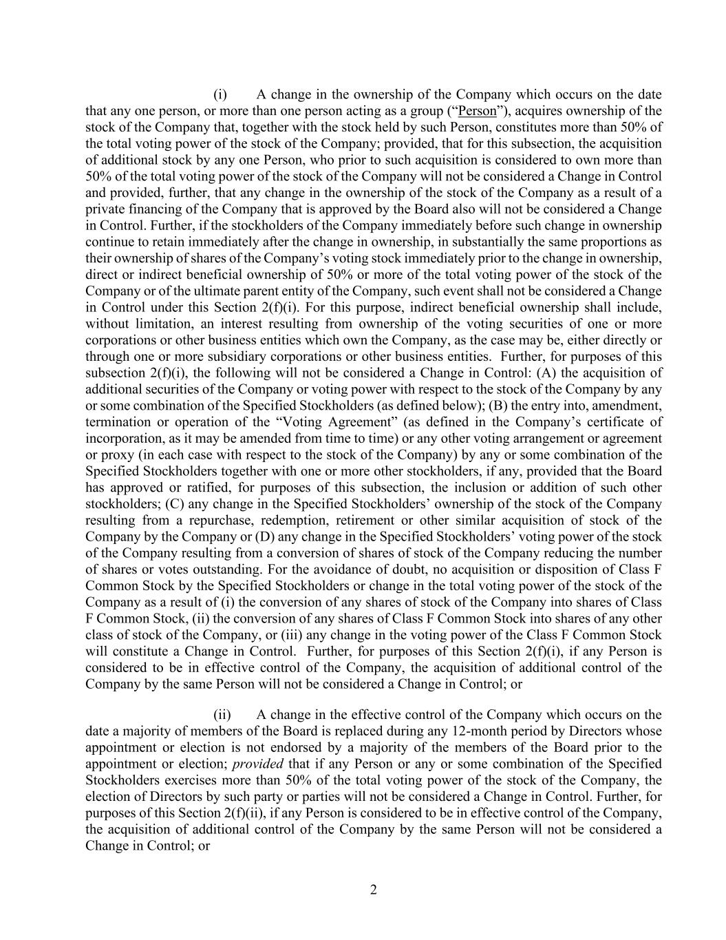 2 (i) A change in the ownership of the Company which occurs on the date that any one person, or more than one person acting as a group (“Person”), acquires ownership of the stock of the Company that, together with the stock held by such Person, constitutes more than 50% of the total voting power of the stock of the Company; provided, that for this subsection, the acquisition of additional stock by any one Person, who prior to such acquisition is considered to own more than 50% of the total voting power of the stock of the Company will not be considered a Change in Control and provided, further, that any change in the ownership of the stock of the Company as a result of a private financing of the Company that is approved by the Board also will not be considered a Change in Control. Further, if the stockholders of the Company immediately before such change in ownership continue to retain immediately after the change in ownership, in substantially the same proportions as their ownership of shares of the Company’s voting stock immediately prior to the change in ownership, direct or indirect beneficial ownership of 50% or more of the total voting power of the stock of the Company or of the ultimate parent entity of the Company, such event shall not be considered a Change in Control under this Section 2(f)(i). For this purpose, indirect beneficial ownership shall include, without limitation, an interest resulting from ownership of the voting securities of one or more corporations or other business entities which own the Company, as the case may be, either directly or through one or more subsidiary corporations or other business entities. Further, for purposes of this subsection 2(f)(i), the following will not be considered a Change in Control: (A) the acquisition of additional securities of the Company or voting power with respect to the stock of the Company by any or some combination of the Specified Stockholders (as defined below); (B) the entry into, amendment, termination or operation of the “Voting Agreement” (as defined in the Company’s certificate of incorporation, as it may be amended from time to time) or any other voting arrangement or agreement or proxy (in each case with respect to the stock of the Company) by any or some combination of the Specified Stockholders together with one or more other stockholders, if any, provided that the Board has approved or ratified, for purposes of this subsection, the inclusion or addition of such other stockholders; (C) any change in the Specified Stockholders’ ownership of the stock of the Company resulting from a repurchase, redemption, retirement or other similar acquisition of stock of the Company by the Company or (D) any change in the Specified Stockholders’ voting power of the stock of the Company resulting from a conversion of shares of stock of the Company reducing the number of shares or votes outstanding. For the avoidance of doubt, no acquisition or disposition of Class F Common Stock by the Specified Stockholders or change in the total voting power of the stock of the Company as a result of (i) the conversion of any shares of stock of the Company into shares of Class F Common Stock, (ii) the conversion of any shares of Class F Common Stock into shares of any other class of stock of the Company, or (iii) any change in the voting power of the Class F Common Stock will constitute a Change in Control. Further, for purposes of this Section 2(f)(i), if any Person is considered to be in effective control of the Company, the acquisition of additional control of the Company by the same Person will not be considered a Change in Control; or (ii) A change in the effective control of the Company which occurs on the date a majority of members of the Board is replaced during any 12-month period by Directors whose appointment or election is not endorsed by a majority of the members of the Board prior to the appointment or election; provided that if any Person or any or some combination of the Specified Stockholders exercises more than 50% of the total voting power of the stock of the Company, the election of Directors by such party or parties will not be considered a Change in Control. Further, for purposes of this Section 2(f)(ii), if any Person is considered to be in effective control of the Company, the acquisition of additional control of the Company by the same Person will not be considered a Change in Control; or