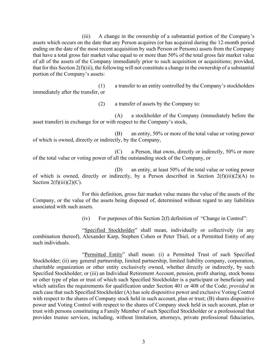 3 (iii) A change in the ownership of a substantial portion of the Company’s assets which occurs on the date that any Person acquires (or has acquired during the 12-month period ending on the date of the most recent acquisition by such Person or Persons) assets from the Company that have a total gross fair market value equal to or more than 50% of the total gross fair market value of all of the assets of the Company immediately prior to such acquisition or acquisitions; provided, that for this Section 2(f)(iii), the following will not constitute a change in the ownership of a substantial portion of the Company’s assets: (1) a transfer to an entity controlled by the Company’s stockholders immediately after the transfer, or (2) a transfer of assets by the Company to: (A) a stockholder of the Company (immediately before the asset transfer) in exchange for or with respect to the Company’s stock, (B) an entity, 50% or more of the total value or voting power of which is owned, directly or indirectly, by the Company, (C) a Person, that owns, directly or indirectly, 50% or more of the total value or voting power of all the outstanding stock of the Company, or (D) an entity, at least 50% of the total value or voting power of which is owned, directly or indirectly, by a Person described in Section 2(f)(iii)(2)(A) to Section 2(f)(iii)(2)(C). For this definition, gross fair market value means the value of the assets of the Company, or the value of the assets being disposed of, determined without regard to any liabilities associated with such assets. (iv) For purposes of this Section 2(f) definition of “Change in Control”: “Specified Stockholder” shall mean, individually or collectively (in any combination thereof), Alexander Karp, Stephen Cohen or Peter Thiel, or a Permitted Entity of any such individuals. “Permitted Entity” shall mean: (i) a Permitted Trust of such Specified Stockholder; (ii) any general partnership, limited partnership, limited liability company, corporation, charitable organization or other entity exclusively owned, whether directly or indirectly, by such Specified Stockholder; or (iii) an Individual Retirement Account, pension, profit sharing, stock bonus or other type of plan or trust of which such Specified Stockholder is a participant or beneficiary and which satisfies the requirements for qualification under Section 401 or 408 of the Code; provided in each case that such Specified Stockholder (A) has sole dispositive power and exclusive Voting Control with respect to the shares of Company stock held in such account, plan or trust; (B) shares dispositive power and Voting Control with respect to the shares of Company stock held in such account, plan or trust with persons constituting a Family Member of such Specified Stockholder or a professional that provides trustee services, including, without limitation, attorneys, private professional fiduciaries,