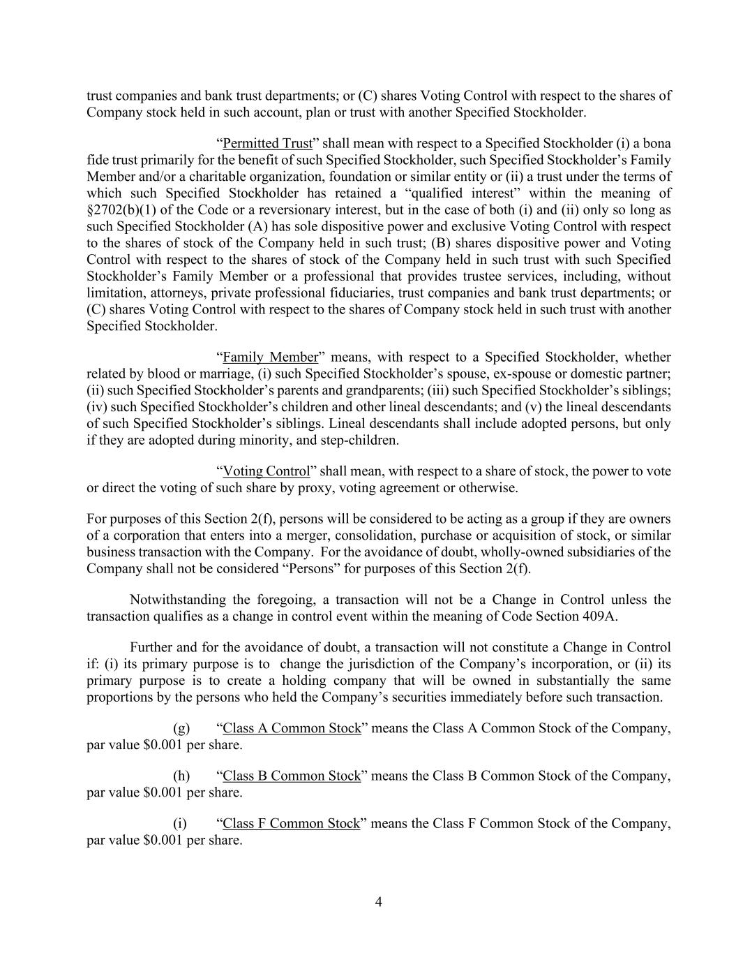 4 trust companies and bank trust departments; or (C) shares Voting Control with respect to the shares of Company stock held in such account, plan or trust with another Specified Stockholder. “Permitted Trust” shall mean with respect to a Specified Stockholder (i) a bona fide trust primarily for the benefit of such Specified Stockholder, such Specified Stockholder’s Family Member and/or a charitable organization, foundation or similar entity or (ii) a trust under the terms of which such Specified Stockholder has retained a “qualified interest” within the meaning of §2702(b)(1) of the Code or a reversionary interest, but in the case of both (i) and (ii) only so long as such Specified Stockholder (A) has sole dispositive power and exclusive Voting Control with respect to the shares of stock of the Company held in such trust; (B) shares dispositive power and Voting Control with respect to the shares of stock of the Company held in such trust with such Specified Stockholder’s Family Member or a professional that provides trustee services, including, without limitation, attorneys, private professional fiduciaries, trust companies and bank trust departments; or (C) shares Voting Control with respect to the shares of Company stock held in such trust with another Specified Stockholder. “Family Member” means, with respect to a Specified Stockholder, whether related by blood or marriage, (i) such Specified Stockholder’s spouse, ex-spouse or domestic partner; (ii) such Specified Stockholder’s parents and grandparents; (iii) such Specified Stockholder’s siblings; (iv) such Specified Stockholder’s children and other lineal descendants; and (v) the lineal descendants of such Specified Stockholder’s siblings. Lineal descendants shall include adopted persons, but only if they are adopted during minority, and step-children. “Voting Control” shall mean, with respect to a share of stock, the power to vote or direct the voting of such share by proxy, voting agreement or otherwise. For purposes of this Section 2(f), persons will be considered to be acting as a group if they are owners of a corporation that enters into a merger, consolidation, purchase or acquisition of stock, or similar business transaction with the Company. For the avoidance of doubt, wholly-owned subsidiaries of the Company shall not be considered “Persons” for purposes of this Section 2(f). Notwithstanding the foregoing, a transaction will not be a Change in Control unless the transaction qualifies as a change in control event within the meaning of Code Section 409A. Further and for the avoidance of doubt, a transaction will not constitute a Change in Control if: (i) its primary purpose is to change the jurisdiction of the Company’s incorporation, or (ii) its primary purpose is to create a holding company that will be owned in substantially the same proportions by the persons who held the Company’s securities immediately before such transaction. (g) “Class A Common Stock” means the Class A Common Stock of the Company, par value $0.001 per share. (h) “Class B Common Stock” means the Class B Common Stock of the Company, par value $0.001 per share. (i) “Class F Common Stock” means the Class F Common Stock of the Company, par value $0.001 per share.