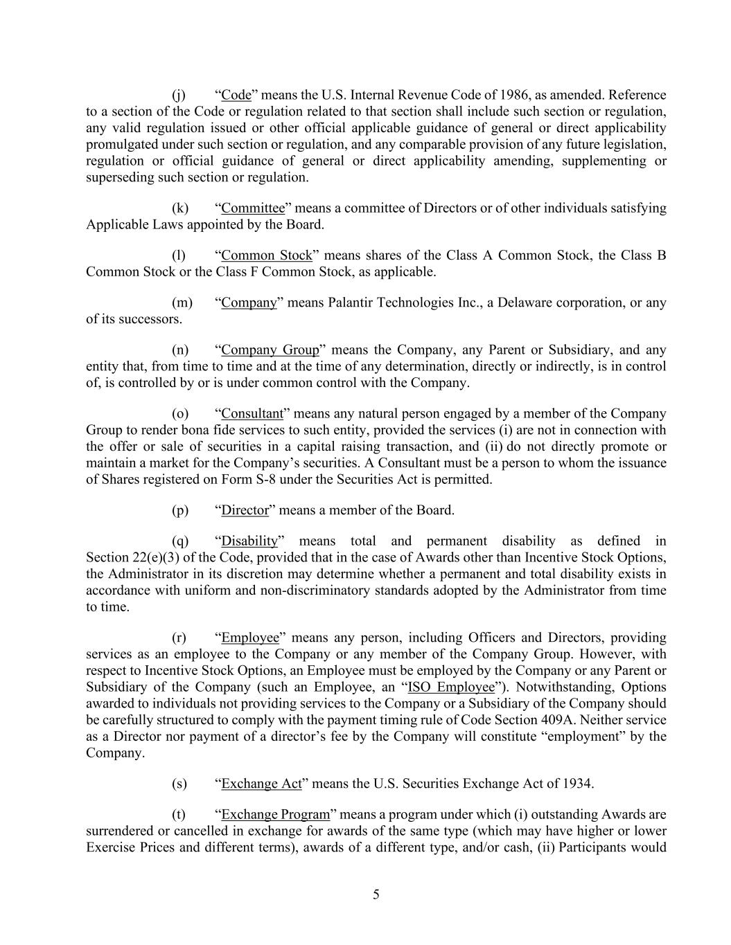 5 (j) “Code” means the U.S. Internal Revenue Code of 1986, as amended. Reference to a section of the Code or regulation related to that section shall include such section or regulation, any valid regulation issued or other official applicable guidance of general or direct applicability promulgated under such section or regulation, and any comparable provision of any future legislation, regulation or official guidance of general or direct applicability amending, supplementing or superseding such section or regulation. (k) “Committee” means a committee of Directors or of other individuals satisfying Applicable Laws appointed by the Board. (l) “Common Stock” means shares of the Class A Common Stock, the Class B Common Stock or the Class F Common Stock, as applicable. (m) “Company” means Palantir Technologies Inc., a Delaware corporation, or any of its successors. (n) “Company Group” means the Company, any Parent or Subsidiary, and any entity that, from time to time and at the time of any determination, directly or indirectly, is in control of, is controlled by or is under common control with the Company. (o) “Consultant” means any natural person engaged by a member of the Company Group to render bona fide services to such entity, provided the services (i) are not in connection with the offer or sale of securities in a capital raising transaction, and (ii) do not directly promote or maintain a market for the Company’s securities. A Consultant must be a person to whom the issuance of Shares registered on Form S-8 under the Securities Act is permitted. (p) “Director” means a member of the Board. (q) “Disability” means total and permanent disability as defined in Section 22(e)(3) of the Code, provided that in the case of Awards other than Incentive Stock Options, the Administrator in its discretion may determine whether a permanent and total disability exists in accordance with uniform and non-discriminatory standards adopted by the Administrator from time to time. (r) “Employee” means any person, including Officers and Directors, providing services as an employee to the Company or any member of the Company Group. However, with respect to Incentive Stock Options, an Employee must be employed by the Company or any Parent or Subsidiary of the Company (such an Employee, an “ISO Employee”). Notwithstanding, Options awarded to individuals not providing services to the Company or a Subsidiary of the Company should be carefully structured to comply with the payment timing rule of Code Section 409A. Neither service as a Director nor payment of a director’s fee by the Company will constitute “employment” by the Company. (s) “Exchange Act” means the U.S. Securities Exchange Act of 1934. (t) “Exchange Program” means a program under which (i) outstanding Awards are surrendered or cancelled in exchange for awards of the same type (which may have higher or lower Exercise Prices and different terms), awards of a different type, and/or cash, (ii) Participants would
