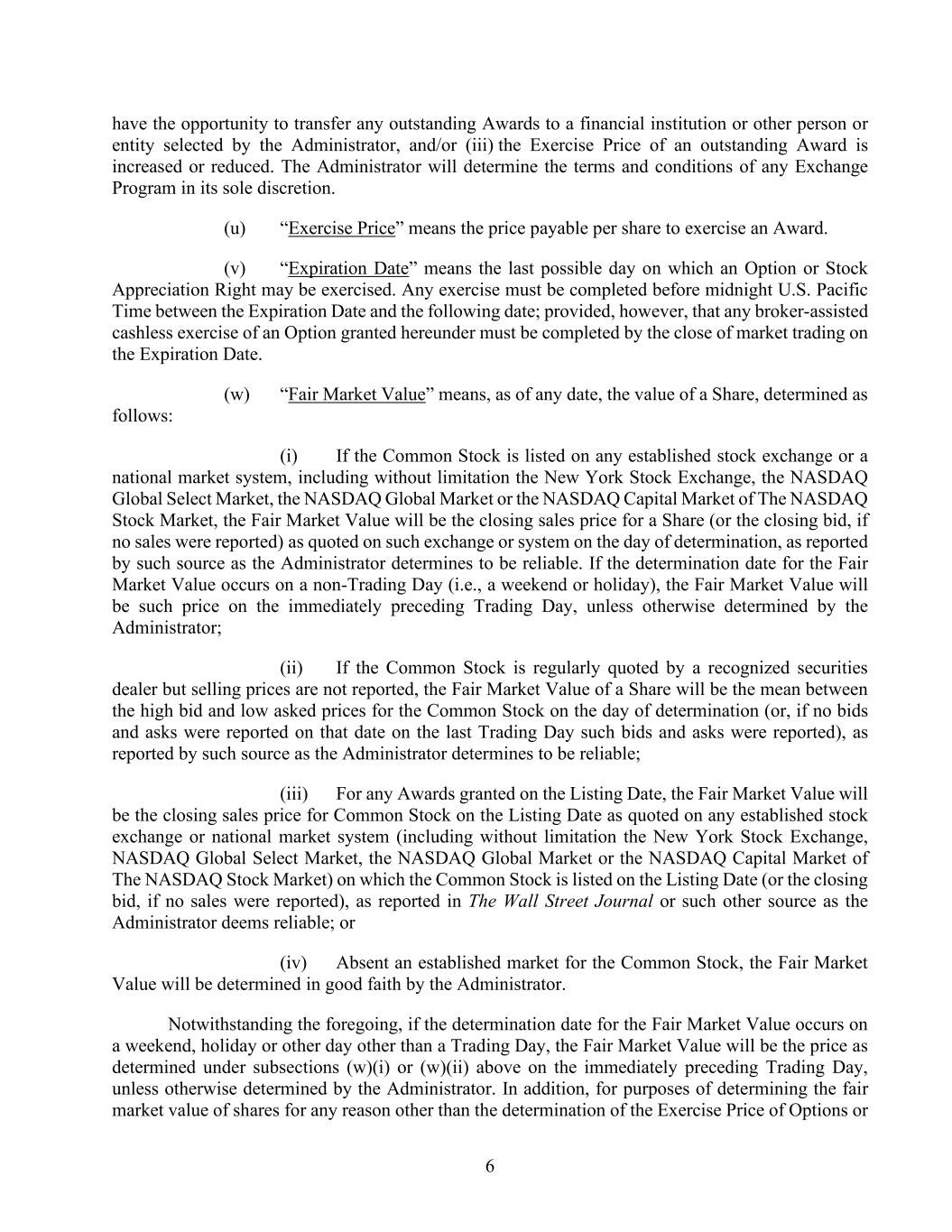 6 have the opportunity to transfer any outstanding Awards to a financial institution or other person or entity selected by the Administrator, and/or (iii) the Exercise Price of an outstanding Award is increased or reduced. The Administrator will determine the terms and conditions of any Exchange Program in its sole discretion. (u) “Exercise Price” means the price payable per share to exercise an Award. (v) “Expiration Date” means the last possible day on which an Option or Stock Appreciation Right may be exercised. Any exercise must be completed before midnight U.S. Pacific Time between the Expiration Date and the following date; provided, however, that any broker-assisted cashless exercise of an Option granted hereunder must be completed by the close of market trading on the Expiration Date. (w) “Fair Market Value” means, as of any date, the value of a Share, determined as follows: (i) If the Common Stock is listed on any established stock exchange or a national market system, including without limitation the New York Stock Exchange, the NASDAQ Global Select Market, the NASDAQ Global Market or the NASDAQ Capital Market of The NASDAQ Stock Market, the Fair Market Value will be the closing sales price for a Share (or the closing bid, if no sales were reported) as quoted on such exchange or system on the day of determination, as reported by such source as the Administrator determines to be reliable. If the determination date for the Fair Market Value occurs on a non-Trading Day (i.e., a weekend or holiday), the Fair Market Value will be such price on the immediately preceding Trading Day, unless otherwise determined by the Administrator; (ii) If the Common Stock is regularly quoted by a recognized securities dealer but selling prices are not reported, the Fair Market Value of a Share will be the mean between the high bid and low asked prices for the Common Stock on the day of determination (or, if no bids and asks were reported on that date on the last Trading Day such bids and asks were reported), as reported by such source as the Administrator determines to be reliable; (iii) For any Awards granted on the Listing Date, the Fair Market Value will be the closing sales price for Common Stock on the Listing Date as quoted on any established stock exchange or national market system (including without limitation the New York Stock Exchange, NASDAQ Global Select Market, the NASDAQ Global Market or the NASDAQ Capital Market of The NASDAQ Stock Market) on which the Common Stock is listed on the Listing Date (or the closing bid, if no sales were reported), as reported in The Wall Street Journal or such other source as the Administrator deems reliable; or (iv) Absent an established market for the Common Stock, the Fair Market Value will be determined in good faith by the Administrator. Notwithstanding the foregoing, if the determination date for the Fair Market Value occurs on a weekend, holiday or other day other than a Trading Day, the Fair Market Value will be the price as determined under subsections (w)(i) or (w)(ii) above on the immediately preceding Trading Day, unless otherwise determined by the Administrator. In addition, for purposes of determining the fair market value of shares for any reason other than the determination of the Exercise Price of Options or