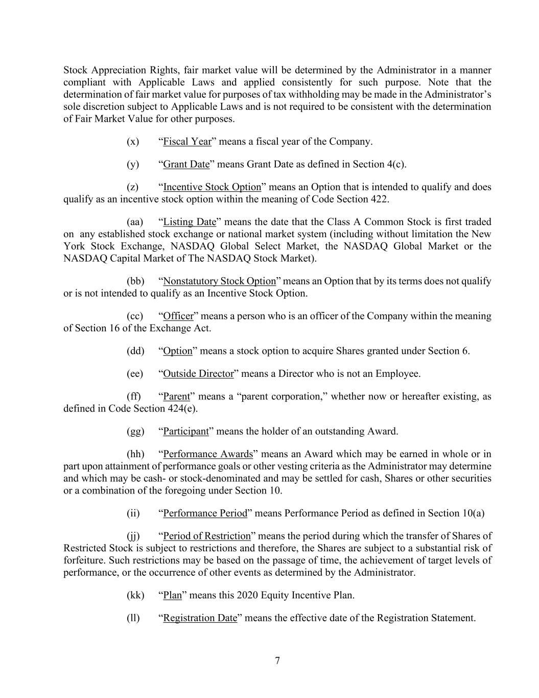 7 Stock Appreciation Rights, fair market value will be determined by the Administrator in a manner compliant with Applicable Laws and applied consistently for such purpose. Note that the determination of fair market value for purposes of tax withholding may be made in the Administrator’s sole discretion subject to Applicable Laws and is not required to be consistent with the determination of Fair Market Value for other purposes. (x) “Fiscal Year” means a fiscal year of the Company. (y) “Grant Date” means Grant Date as defined in Section 4(c). (z) “Incentive Stock Option” means an Option that is intended to qualify and does qualify as an incentive stock option within the meaning of Code Section 422. (aa) “Listing Date” means the date that the Class A Common Stock is first traded on any established stock exchange or national market system (including without limitation the New York Stock Exchange, NASDAQ Global Select Market, the NASDAQ Global Market or the NASDAQ Capital Market of The NASDAQ Stock Market). (bb) “Nonstatutory Stock Option” means an Option that by its terms does not qualify or is not intended to qualify as an Incentive Stock Option. (cc) “Officer” means a person who is an officer of the Company within the meaning of Section 16 of the Exchange Act. (dd) “Option” means a stock option to acquire Shares granted under Section 6. (ee) “Outside Director” means a Director who is not an Employee. (ff) “Parent” means a “parent corporation,” whether now or hereafter existing, as defined in Code Section 424(e). (gg) “Participant” means the holder of an outstanding Award. (hh) “Performance Awards” means an Award which may be earned in whole or in part upon attainment of performance goals or other vesting criteria as the Administrator may determine and which may be cash- or stock-denominated and may be settled for cash, Shares or other securities or a combination of the foregoing under Section 10. (ii) “Performance Period” means Performance Period as defined in Section 10(a) (jj) “Period of Restriction” means the period during which the transfer of Shares of Restricted Stock is subject to restrictions and therefore, the Shares are subject to a substantial risk of forfeiture. Such restrictions may be based on the passage of time, the achievement of target levels of performance, or the occurrence of other events as determined by the Administrator. (kk) “Plan” means this 2020 Equity Incentive Plan. (ll) “Registration Date” means the effective date of the Registration Statement.
