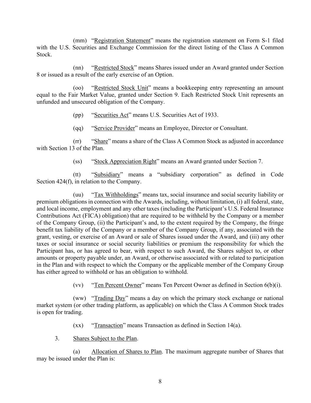 8 (mm) “Registration Statement” means the registration statement on Form S-1 filed with the U.S. Securities and Exchange Commission for the direct listing of the Class A Common Stock. (nn) “Restricted Stock” means Shares issued under an Award granted under Section 8 or issued as a result of the early exercise of an Option. (oo) “Restricted Stock Unit” means a bookkeeping entry representing an amount equal to the Fair Market Value, granted under Section 9. Each Restricted Stock Unit represents an unfunded and unsecured obligation of the Company. (pp) “Securities Act” means U.S. Securities Act of 1933. (qq) “Service Provider” means an Employee, Director or Consultant. (rr) “Share” means a share of the Class A Common Stock as adjusted in accordance with Section 13 of the Plan. (ss) “Stock Appreciation Right” means an Award granted under Section 7. (tt) “Subsidiary” means a “subsidiary corporation” as defined in Code Section 424(f), in relation to the Company. (uu) “Tax Withholdings” means tax, social insurance and social security liability or premium obligations in connection with the Awards, including, without limitation, (i) all federal, state, and local income, employment and any other taxes (including the Participant’s U.S. Federal Insurance Contributions Act (FICA) obligation) that are required to be withheld by the Company or a member of the Company Group, (ii) the Participant’s and, to the extent required by the Company, the fringe benefit tax liability of the Company or a member of the Company Group, if any, associated with the grant, vesting, or exercise of an Award or sale of Shares issued under the Award, and (iii) any other taxes or social insurance or social security liabilities or premium the responsibility for which the Participant has, or has agreed to bear, with respect to such Award, the Shares subject to, or other amounts or property payable under, an Award, or otherwise associated with or related to participation in the Plan and with respect to which the Company or the applicable member of the Company Group has either agreed to withhold or has an obligation to withhold. (vv) “Ten Percent Owner” means Ten Percent Owner as defined in Section 6(b)(i). (ww) “Trading Day” means a day on which the primary stock exchange or national market system (or other trading platform, as applicable) on which the Class A Common Stock trades is open for trading. (xx) “Transaction” means Transaction as defined in Section 14(a). 3. Shares Subject to the Plan. (a) Allocation of Shares to Plan. The maximum aggregate number of Shares that may be issued under the Plan is: