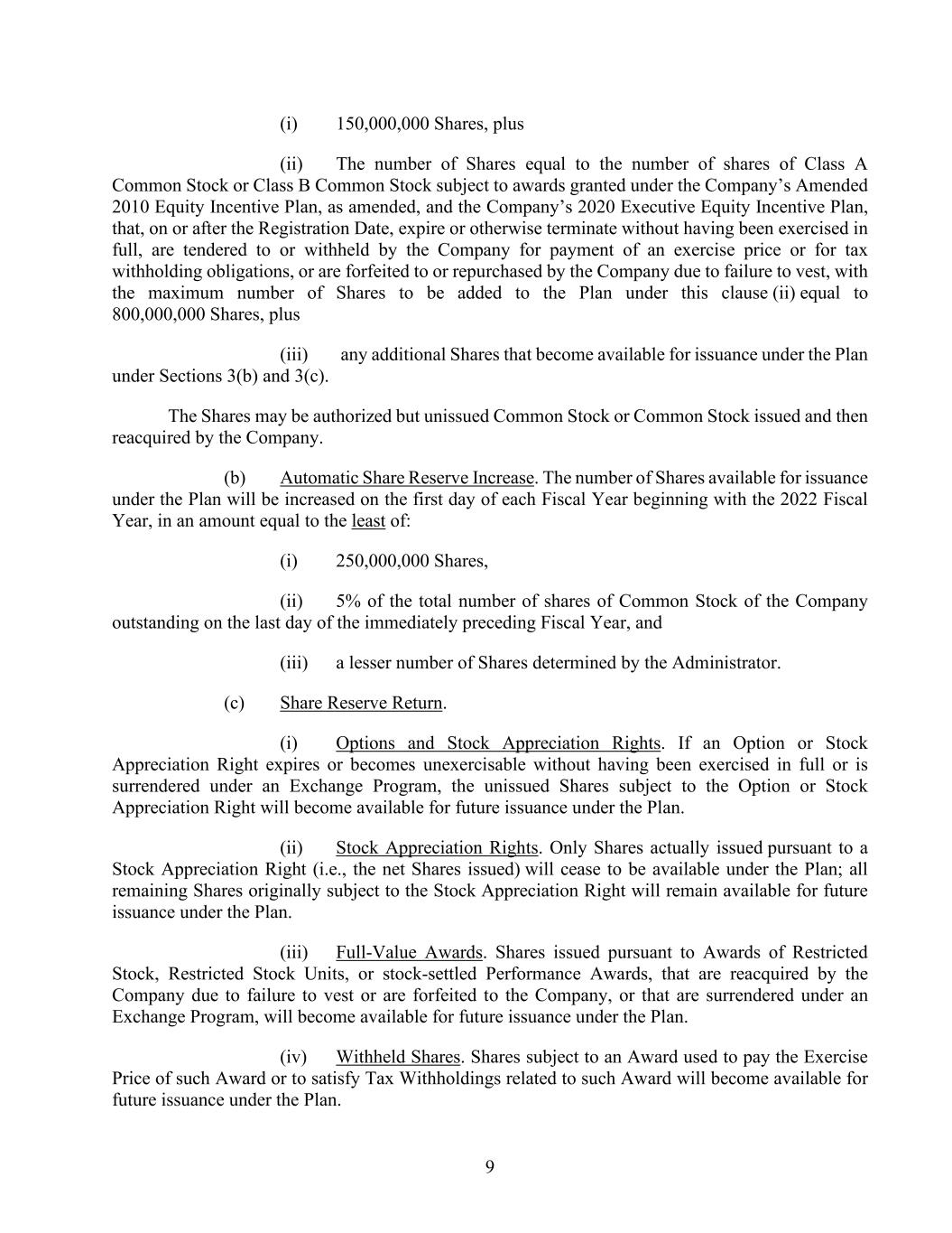 9 (i) 150,000,000 Shares, plus (ii) The number of Shares equal to the number of shares of Class A Common Stock or Class B Common Stock subject to awards granted under the Company’s Amended 2010 Equity Incentive Plan, as amended, and the Company’s 2020 Executive Equity Incentive Plan, that, on or after the Registration Date, expire or otherwise terminate without having been exercised in full, are tendered to or withheld by the Company for payment of an exercise price or for tax withholding obligations, or are forfeited to or repurchased by the Company due to failure to vest, with the maximum number of Shares to be added to the Plan under this clause (ii) equal to 800,000,000 Shares, plus (iii) any additional Shares that become available for issuance under the Plan under Sections 3(b) and 3(c). The Shares may be authorized but unissued Common Stock or Common Stock issued and then reacquired by the Company. (b) Automatic Share Reserve Increase. The number of Shares available for issuance under the Plan will be increased on the first day of each Fiscal Year beginning with the 2022 Fiscal Year, in an amount equal to the least of: (i) 250,000,000 Shares, (ii) 5% of the total number of shares of Common Stock of the Company outstanding on the last day of the immediately preceding Fiscal Year, and (iii) a lesser number of Shares determined by the Administrator. (c) Share Reserve Return. (i) Options and Stock Appreciation Rights. If an Option or Stock Appreciation Right expires or becomes unexercisable without having been exercised in full or is surrendered under an Exchange Program, the unissued Shares subject to the Option or Stock Appreciation Right will become available for future issuance under the Plan. (ii) Stock Appreciation Rights. Only Shares actually issued pursuant to a Stock Appreciation Right (i.e., the net Shares issued) will cease to be available under the Plan; all remaining Shares originally subject to the Stock Appreciation Right will remain available for future issuance under the Plan. (iii) Full-Value Awards. Shares issued pursuant to Awards of Restricted Stock, Restricted Stock Units, or stock-settled Performance Awards, that are reacquired by the Company due to failure to vest or are forfeited to the Company, or that are surrendered under an Exchange Program, will become available for future issuance under the Plan. (iv) Withheld Shares. Shares subject to an Award used to pay the Exercise Price of such Award or to satisfy Tax Withholdings related to such Award will become available for future issuance under the Plan.