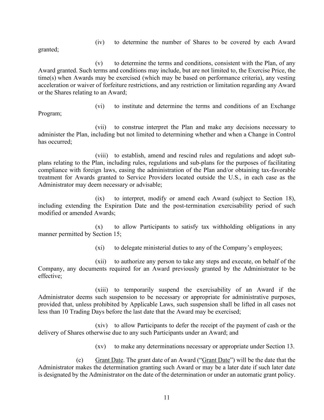 11 (iv) to determine the number of Shares to be covered by each Award granted; (v) to determine the terms and conditions, consistent with the Plan, of any Award granted. Such terms and conditions may include, but are not limited to, the Exercise Price, the time(s) when Awards may be exercised (which may be based on performance criteria), any vesting acceleration or waiver of forfeiture restrictions, and any restriction or limitation regarding any Award or the Shares relating to an Award; (vi) to institute and determine the terms and conditions of an Exchange Program; (vii) to construe interpret the Plan and make any decisions necessary to administer the Plan, including but not limited to determining whether and when a Change in Control has occurred; (viii) to establish, amend and rescind rules and regulations and adopt sub- plans relating to the Plan, including rules, regulations and sub-plans for the purposes of facilitating compliance with foreign laws, easing the administration of the Plan and/or obtaining tax-favorable treatment for Awards granted to Service Providers located outside the U.S., in each case as the Administrator may deem necessary or advisable; (ix) to interpret, modify or amend each Award (subject to Section 18), including extending the Expiration Date and the post-termination exercisability period of such modified or amended Awards; (x) to allow Participants to satisfy tax withholding obligations in any manner permitted by Section 15; (xi) to delegate ministerial duties to any of the Company’s employees; (xii) to authorize any person to take any steps and execute, on behalf of the Company, any documents required for an Award previously granted by the Administrator to be effective; (xiii) to temporarily suspend the exercisability of an Award if the Administrator deems such suspension to be necessary or appropriate for administrative purposes, provided that, unless prohibited by Applicable Laws, such suspension shall be lifted in all cases not less than 10 Trading Days before the last date that the Award may be exercised; (xiv) to allow Participants to defer the receipt of the payment of cash or the delivery of Shares otherwise due to any such Participants under an Award; and (xv) to make any determinations necessary or appropriate under Section 13. (c) Grant Date. The grant date of an Award (“Grant Date”) will be the date that the Administrator makes the determination granting such Award or may be a later date if such later date is designated by the Administrator on the date of the determination or under an automatic grant policy.