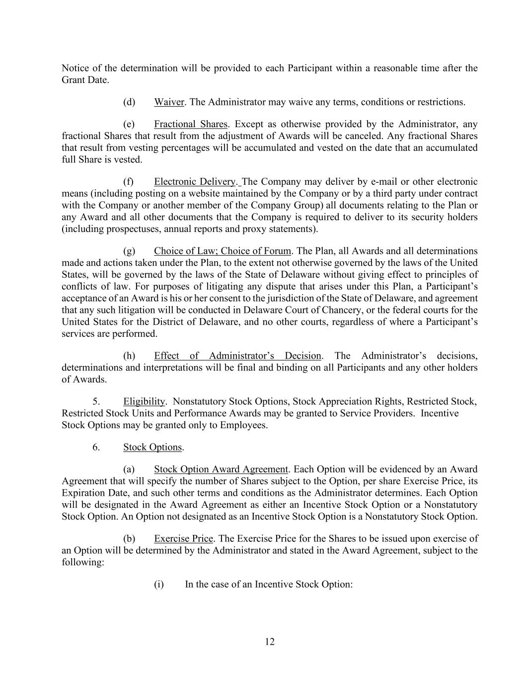 12 Notice of the determination will be provided to each Participant within a reasonable time after the Grant Date. (d) Waiver. The Administrator may waive any terms, conditions or restrictions. (e) Fractional Shares. Except as otherwise provided by the Administrator, any fractional Shares that result from the adjustment of Awards will be canceled. Any fractional Shares that result from vesting percentages will be accumulated and vested on the date that an accumulated full Share is vested. (f) Electronic Delivery. The Company may deliver by e-mail or other electronic means (including posting on a website maintained by the Company or by a third party under contract with the Company or another member of the Company Group) all documents relating to the Plan or any Award and all other documents that the Company is required to deliver to its security holders (including prospectuses, annual reports and proxy statements). (g) Choice of Law; Choice of Forum. The Plan, all Awards and all determinations made and actions taken under the Plan, to the extent not otherwise governed by the laws of the United States, will be governed by the laws of the State of Delaware without giving effect to principles of conflicts of law. For purposes of litigating any dispute that arises under this Plan, a Participant’s acceptance of an Award is his or her consent to the jurisdiction of the State of Delaware, and agreement that any such litigation will be conducted in Delaware Court of Chancery, or the federal courts for the United States for the District of Delaware, and no other courts, regardless of where a Participant’s services are performed. (h) Effect of Administrator’s Decision. The Administrator’s decisions, determinations and interpretations will be final and binding on all Participants and any other holders of Awards. 5. Eligibility. Nonstatutory Stock Options, Stock Appreciation Rights, Restricted Stock, Restricted Stock Units and Performance Awards may be granted to Service Providers. Incentive Stock Options may be granted only to Employees. 6. Stock Options. (a) Stock Option Award Agreement. Each Option will be evidenced by an Award Agreement that will specify the number of Shares subject to the Option, per share Exercise Price, its Expiration Date, and such other terms and conditions as the Administrator determines. Each Option will be designated in the Award Agreement as either an Incentive Stock Option or a Nonstatutory Stock Option. An Option not designated as an Incentive Stock Option is a Nonstatutory Stock Option. (b) Exercise Price. The Exercise Price for the Shares to be issued upon exercise of an Option will be determined by the Administrator and stated in the Award Agreement, subject to the following: (i) In the case of an Incentive Stock Option: