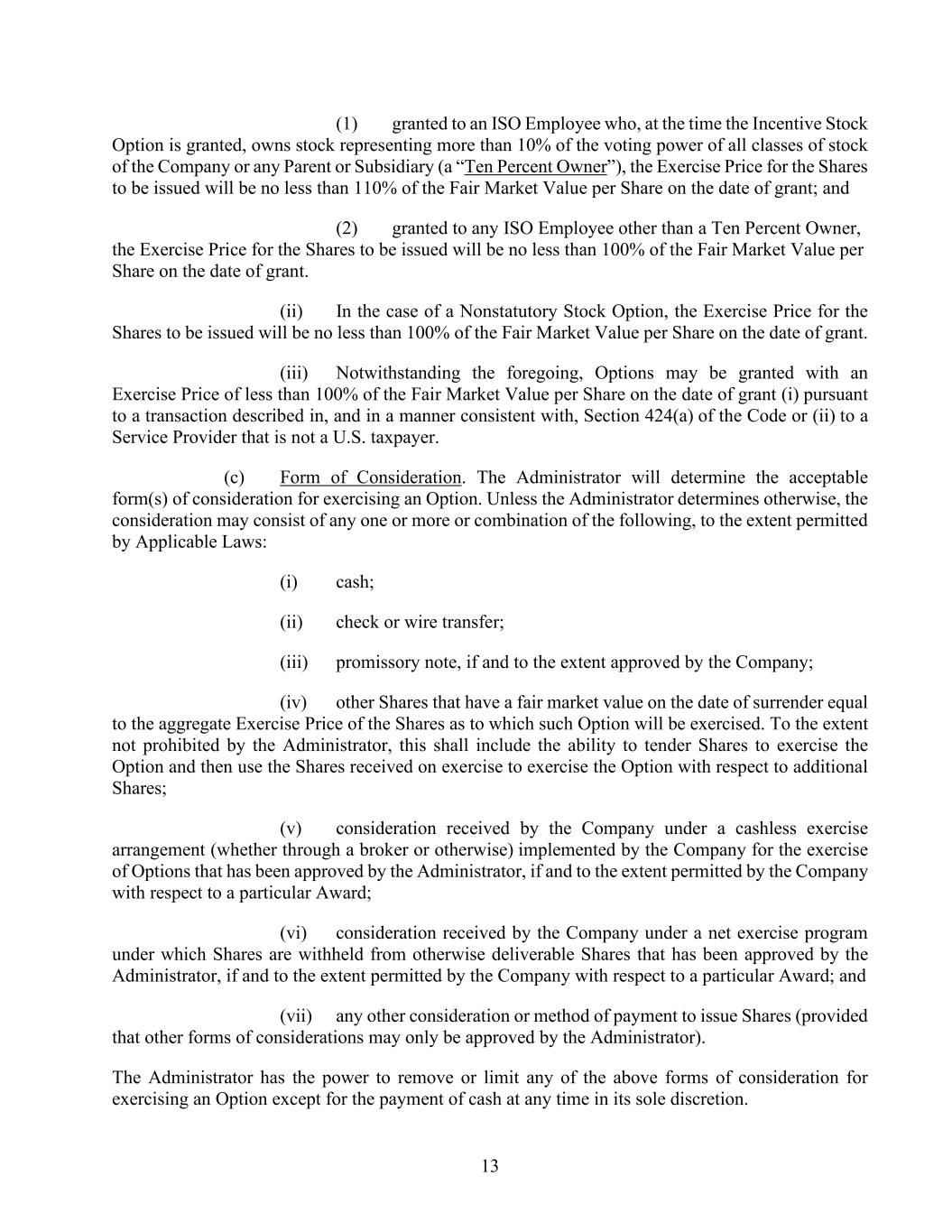 13 (1) granted to an ISO Employee who, at the time the Incentive Stock Option is granted, owns stock representing more than 10% of the voting power of all classes of stock of the Company or any Parent or Subsidiary (a “Ten Percent Owner”), the Exercise Price for the Shares to be issued will be no less than 110% of the Fair Market Value per Share on the date of grant; and (2) granted to any ISO Employee other than a Ten Percent Owner, the Exercise Price for the Shares to be issued will be no less than 100% of the Fair Market Value per Share on the date of grant. (ii) In the case of a Nonstatutory Stock Option, the Exercise Price for the Shares to be issued will be no less than 100% of the Fair Market Value per Share on the date of grant. (iii) Notwithstanding the foregoing, Options may be granted with an Exercise Price of less than 100% of the Fair Market Value per Share on the date of grant (i) pursuant to a transaction described in, and in a manner consistent with, Section 424(a) of the Code or (ii) to a Service Provider that is not a U.S. taxpayer. (c) Form of Consideration. The Administrator will determine the acceptable form(s) of consideration for exercising an Option. Unless the Administrator determines otherwise, the consideration may consist of any one or more or combination of the following, to the extent permitted by Applicable Laws: (i) cash; (ii) check or wire transfer; (iii) promissory note, if and to the extent approved by the Company; (iv) other Shares that have a fair market value on the date of surrender equal to the aggregate Exercise Price of the Shares as to which such Option will be exercised. To the extent not prohibited by the Administrator, this shall include the ability to tender Shares to exercise the Option and then use the Shares received on exercise to exercise the Option with respect to additional Shares; (v) consideration received by the Company under a cashless exercise arrangement (whether through a broker or otherwise) implemented by the Company for the exercise of Options that has been approved by the Administrator, if and to the extent permitted by the Company with respect to a particular Award; (vi) consideration received by the Company under a net exercise program under which Shares are withheld from otherwise deliverable Shares that has been approved by the Administrator, if and to the extent permitted by the Company with respect to a particular Award; and (vii) any other consideration or method of payment to issue Shares (provided that other forms of considerations may only be approved by the Administrator). The Administrator has the power to remove or limit any of the above forms of consideration for exercising an Option except for the payment of cash at any time in its sole discretion.
