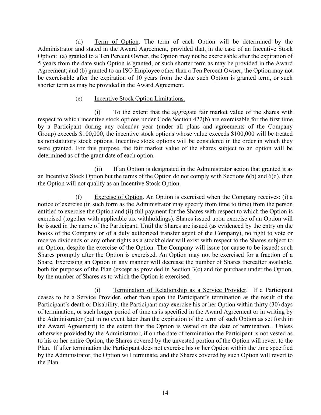 14 (d) Term of Option. The term of each Option will be determined by the Administrator and stated in the Award Agreement, provided that, in the case of an Incentive Stock Option: (a) granted to a Ten Percent Owner, the Option may not be exercisable after the expiration of 5 years from the date such Option is granted, or such shorter term as may be provided in the Award Agreement; and (b) granted to an ISO Employee other than a Ten Percent Owner, the Option may not be exercisable after the expiration of 10 years from the date such Option is granted term, or such shorter term as may be provided in the Award Agreement. (e) Incentive Stock Option Limitations. (i) To the extent that the aggregate fair market value of the shares with respect to which incentive stock options under Code Section 422(b) are exercisable for the first time by a Participant during any calendar year (under all plans and agreements of the Company Group) exceeds $100,000, the incentive stock options whose value exceeds $100,000 will be treated as nonstatutory stock options. Incentive stock options will be considered in the order in which they were granted. For this purpose, the fair market value of the shares subject to an option will be determined as of the grant date of each option. (ii) If an Option is designated in the Administrator action that granted it as an Incentive Stock Option but the terms of the Option do not comply with Sections 6(b) and 6(d), then the Option will not qualify as an Incentive Stock Option. (f) Exercise of Option. An Option is exercised when the Company receives: (i) a notice of exercise (in such form as the Administrator may specify from time to time) from the person entitled to exercise the Option and (ii) full payment for the Shares with respect to which the Option is exercised (together with applicable tax withholdings). Shares issued upon exercise of an Option will be issued in the name of the Participant. Until the Shares are issued (as evidenced by the entry on the books of the Company or of a duly authorized transfer agent of the Company), no right to vote or receive dividends or any other rights as a stockholder will exist with respect to the Shares subject to an Option, despite the exercise of the Option. The Company will issue (or cause to be issued) such Shares promptly after the Option is exercised. An Option may not be exercised for a fraction of a Share. Exercising an Option in any manner will decrease the number of Shares thereafter available, both for purposes of the Plan (except as provided in Section 3(c) and for purchase under the Option, by the number of Shares as to which the Option is exercised. (i) Termination of Relationship as a Service Provider. If a Participant ceases to be a Service Provider, other than upon the Participant’s termination as the result of the Participant’s death or Disability, the Participant may exercise his or her Option within thirty (30) days of termination, or such longer period of time as is specified in the Award Agreement or in writing by the Administrator (but in no event later than the expiration of the term of such Option as set forth in the Award Agreement) to the extent that the Option is vested on the date of termination. Unless otherwise provided by the Administrator, if on the date of termination the Participant is not vested as to his or her entire Option, the Shares covered by the unvested portion of the Option will revert to the Plan. If after termination the Participant does not exercise his or her Option within the time specified by the Administrator, the Option will terminate, and the Shares covered by such Option will revert to the Plan.