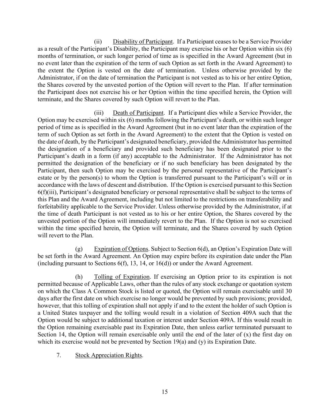 15 (ii) Disability of Participant. If a Participant ceases to be a Service Provider as a result of the Participant’s Disability, the Participant may exercise his or her Option within six (6) months of termination, or such longer period of time as is specified in the Award Agreement (but in no event later than the expiration of the term of such Option as set forth in the Award Agreement) to the extent the Option is vested on the date of termination. Unless otherwise provided by the Administrator, if on the date of termination the Participant is not vested as to his or her entire Option, the Shares covered by the unvested portion of the Option will revert to the Plan. If after termination the Participant does not exercise his or her Option within the time specified herein, the Option will terminate, and the Shares covered by such Option will revert to the Plan. (iii) Death of Participant. If a Participant dies while a Service Provider, the Option may be exercised within six (6) months following the Participant’s death, or within such longer period of time as is specified in the Award Agreement (but in no event later than the expiration of the term of such Option as set forth in the Award Agreement) to the extent that the Option is vested on the date of death, by the Participant’s designated beneficiary, provided the Administrator has permitted the designation of a beneficiary and provided such beneficiary has been designated prior to the Participant’s death in a form (if any) acceptable to the Administrator. If the Administrator has not permitted the designation of the beneficiary or if no such beneficiary has been designated by the Participant, then such Option may be exercised by the personal representative of the Participant’s estate or by the person(s) to whom the Option is transferred pursuant to the Participant’s will or in accordance with the laws of descent and distribution. If the Option is exercised pursuant to this Section 6(f)(iii), Participant’s designated beneficiary or personal representative shall be subject to the terms of this Plan and the Award Agreement, including but not limited to the restrictions on transferability and forfeitability applicable to the Service Provider. Unless otherwise provided by the Administrator, if at the time of death Participant is not vested as to his or her entire Option, the Shares covered by the unvested portion of the Option will immediately revert to the Plan. If the Option is not so exercised within the time specified herein, the Option will terminate, and the Shares covered by such Option will revert to the Plan. (g) Expiration of Options. Subject to Section 6(d), an Option’s Expiration Date will be set forth in the Award Agreement. An Option may expire before its expiration date under the Plan (including pursuant to Sections 6(f), 13, 14, or 16(d)) or under the Award Agreement. (h) Tolling of Expiration. If exercising an Option prior to its expiration is not permitted because of Applicable Laws, other than the rules of any stock exchange or quotation system on which the Class A Common Stock is listed or quoted, the Option will remain exercisable until 30 days after the first date on which exercise no longer would be prevented by such provisions; provided, however, that this tolling of expiration shall not apply if and to the extent the holder of such Option is a United States taxpayer and the tolling would result in a violation of Section 409A such that the Option would be subject to additional taxation or interest under Section 409A. If this would result in the Option remaining exercisable past its Expiration Date, then unless earlier terminated pursuant to Section 14, the Option will remain exercisable only until the end of the later of (x) the first day on which its exercise would not be prevented by Section 19(a) and (y) its Expiration Date. 7. Stock Appreciation Rights.