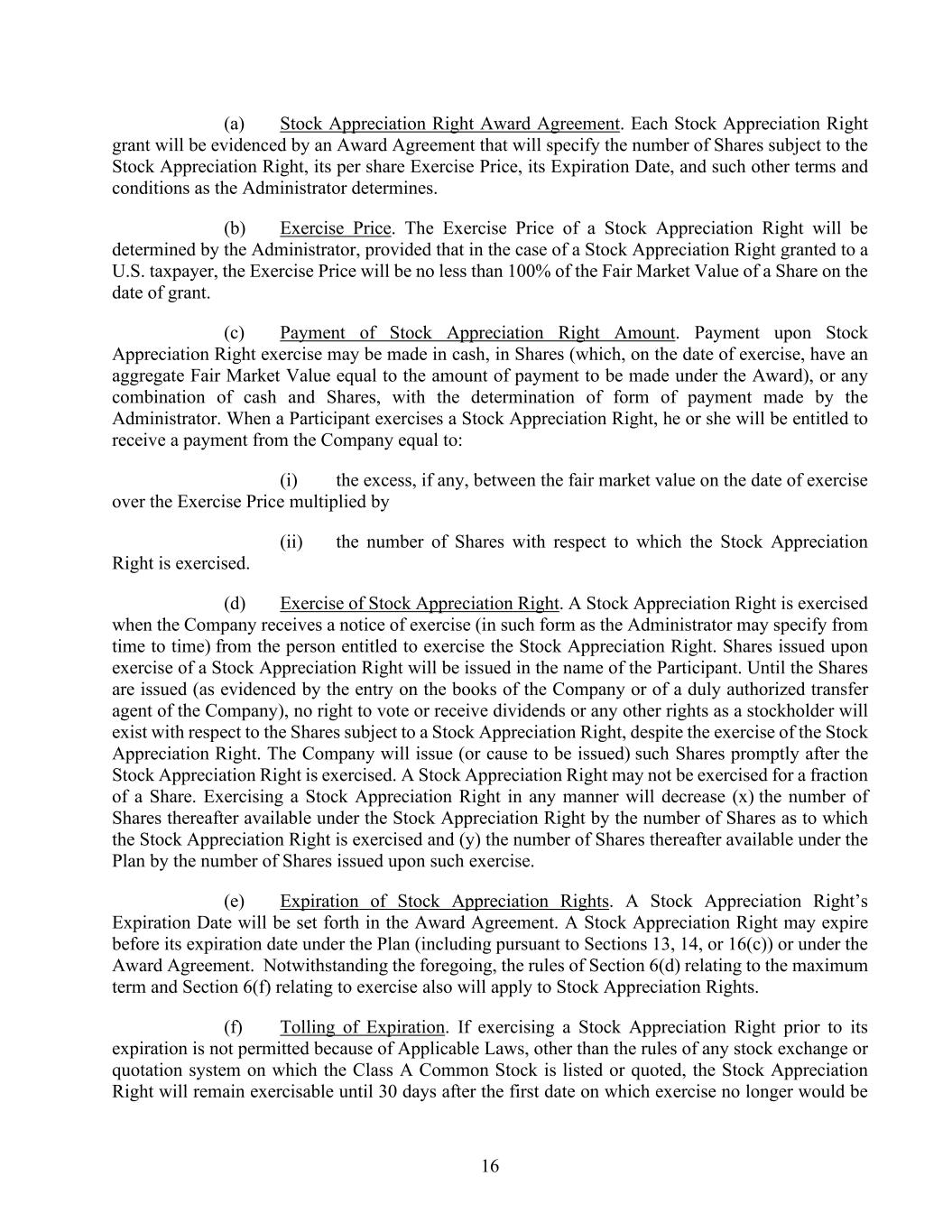 16 (a) Stock Appreciation Right Award Agreement. Each Stock Appreciation Right grant will be evidenced by an Award Agreement that will specify the number of Shares subject to the Stock Appreciation Right, its per share Exercise Price, its Expiration Date, and such other terms and conditions as the Administrator determines. (b) Exercise Price. The Exercise Price of a Stock Appreciation Right will be determined by the Administrator, provided that in the case of a Stock Appreciation Right granted to a U.S. taxpayer, the Exercise Price will be no less than 100% of the Fair Market Value of a Share on the date of grant. (c) Payment of Stock Appreciation Right Amount. Payment upon Stock Appreciation Right exercise may be made in cash, in Shares (which, on the date of exercise, have an aggregate Fair Market Value equal to the amount of payment to be made under the Award), or any combination of cash and Shares, with the determination of form of payment made by the Administrator. When a Participant exercises a Stock Appreciation Right, he or she will be entitled to receive a payment from the Company equal to: (i) the excess, if any, between the fair market value on the date of exercise over the Exercise Price multiplied by (ii) the number of Shares with respect to which the Stock Appreciation Right is exercised. (d) Exercise of Stock Appreciation Right. A Stock Appreciation Right is exercised when the Company receives a notice of exercise (in such form as the Administrator may specify from time to time) from the person entitled to exercise the Stock Appreciation Right. Shares issued upon exercise of a Stock Appreciation Right will be issued in the name of the Participant. Until the Shares are issued (as evidenced by the entry on the books of the Company or of a duly authorized transfer agent of the Company), no right to vote or receive dividends or any other rights as a stockholder will exist with respect to the Shares subject to a Stock Appreciation Right, despite the exercise of the Stock Appreciation Right. The Company will issue (or cause to be issued) such Shares promptly after the Stock Appreciation Right is exercised. A Stock Appreciation Right may not be exercised for a fraction of a Share. Exercising a Stock Appreciation Right in any manner will decrease (x) the number of Shares thereafter available under the Stock Appreciation Right by the number of Shares as to which the Stock Appreciation Right is exercised and (y) the number of Shares thereafter available under the Plan by the number of Shares issued upon such exercise. (e) Expiration of Stock Appreciation Rights. A Stock Appreciation Right’s Expiration Date will be set forth in the Award Agreement. A Stock Appreciation Right may expire before its expiration date under the Plan (including pursuant to Sections 13, 14, or 16(c)) or under the Award Agreement. Notwithstanding the foregoing, the rules of Section 6(d) relating to the maximum term and Section 6(f) relating to exercise also will apply to Stock Appreciation Rights. (f) Tolling of Expiration. If exercising a Stock Appreciation Right prior to its expiration is not permitted because of Applicable Laws, other than the rules of any stock exchange or quotation system on which the Class A Common Stock is listed or quoted, the Stock Appreciation Right will remain exercisable until 30 days after the first date on which exercise no longer would be