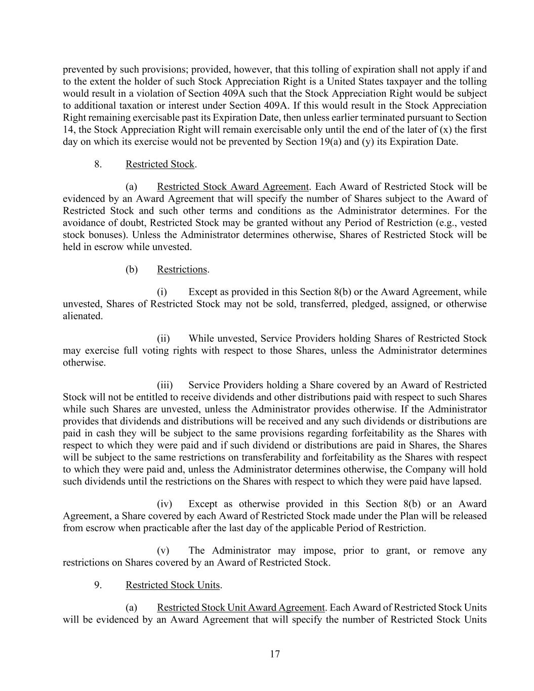 17 prevented by such provisions; provided, however, that this tolling of expiration shall not apply if and to the extent the holder of such Stock Appreciation Right is a United States taxpayer and the tolling would result in a violation of Section 409A such that the Stock Appreciation Right would be subject to additional taxation or interest under Section 409A. If this would result in the Stock Appreciation Right remaining exercisable past its Expiration Date, then unless earlier terminated pursuant to Section 14, the Stock Appreciation Right will remain exercisable only until the end of the later of (x) the first day on which its exercise would not be prevented by Section 19(a) and (y) its Expiration Date. 8. Restricted Stock. (a) Restricted Stock Award Agreement. Each Award of Restricted Stock will be evidenced by an Award Agreement that will specify the number of Shares subject to the Award of Restricted Stock and such other terms and conditions as the Administrator determines. For the avoidance of doubt, Restricted Stock may be granted without any Period of Restriction (e.g., vested stock bonuses). Unless the Administrator determines otherwise, Shares of Restricted Stock will be held in escrow while unvested. (b) Restrictions. (i) Except as provided in this Section 8(b) or the Award Agreement, while unvested, Shares of Restricted Stock may not be sold, transferred, pledged, assigned, or otherwise alienated. (ii) While unvested, Service Providers holding Shares of Restricted Stock may exercise full voting rights with respect to those Shares, unless the Administrator determines otherwise. (iii) Service Providers holding a Share covered by an Award of Restricted Stock will not be entitled to receive dividends and other distributions paid with respect to such Shares while such Shares are unvested, unless the Administrator provides otherwise. If the Administrator provides that dividends and distributions will be received and any such dividends or distributions are paid in cash they will be subject to the same provisions regarding forfeitability as the Shares with respect to which they were paid and if such dividend or distributions are paid in Shares, the Shares will be subject to the same restrictions on transferability and forfeitability as the Shares with respect to which they were paid and, unless the Administrator determines otherwise, the Company will hold such dividends until the restrictions on the Shares with respect to which they were paid have lapsed. (iv) Except as otherwise provided in this Section 8(b) or an Award Agreement, a Share covered by each Award of Restricted Stock made under the Plan will be released from escrow when practicable after the last day of the applicable Period of Restriction. (v) The Administrator may impose, prior to grant, or remove any restrictions on Shares covered by an Award of Restricted Stock. 9. Restricted Stock Units. (a) Restricted Stock Unit Award Agreement. Each Award of Restricted Stock Units will be evidenced by an Award Agreement that will specify the number of Restricted Stock Units