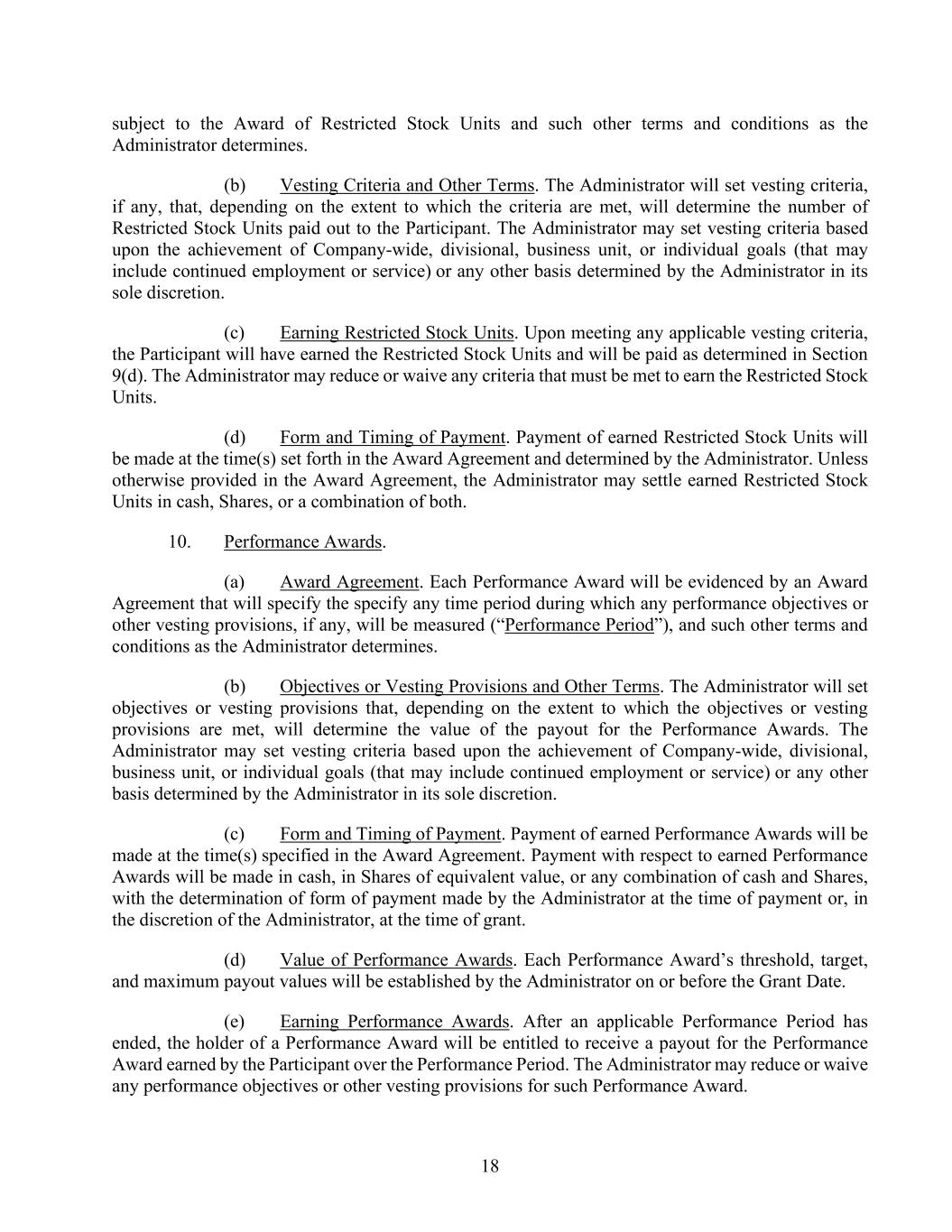 18 subject to the Award of Restricted Stock Units and such other terms and conditions as the Administrator determines. (b) Vesting Criteria and Other Terms. The Administrator will set vesting criteria, if any, that, depending on the extent to which the criteria are met, will determine the number of Restricted Stock Units paid out to the Participant. The Administrator may set vesting criteria based upon the achievement of Company-wide, divisional, business unit, or individual goals (that may include continued employment or service) or any other basis determined by the Administrator in its sole discretion. (c) Earning Restricted Stock Units. Upon meeting any applicable vesting criteria, the Participant will have earned the Restricted Stock Units and will be paid as determined in Section 9(d). The Administrator may reduce or waive any criteria that must be met to earn the Restricted Stock Units. (d) Form and Timing of Payment. Payment of earned Restricted Stock Units will be made at the time(s) set forth in the Award Agreement and determined by the Administrator. Unless otherwise provided in the Award Agreement, the Administrator may settle earned Restricted Stock Units in cash, Shares, or a combination of both. 10. Performance Awards. (a) Award Agreement. Each Performance Award will be evidenced by an Award Agreement that will specify the specify any time period during which any performance objectives or other vesting provisions, if any, will be measured (“Performance Period”), and such other terms and conditions as the Administrator determines. (b) Objectives or Vesting Provisions and Other Terms. The Administrator will set objectives or vesting provisions that, depending on the extent to which the objectives or vesting provisions are met, will determine the value of the payout for the Performance Awards. The Administrator may set vesting criteria based upon the achievement of Company-wide, divisional, business unit, or individual goals (that may include continued employment or service) or any other basis determined by the Administrator in its sole discretion. (c) Form and Timing of Payment. Payment of earned Performance Awards will be made at the time(s) specified in the Award Agreement. Payment with respect to earned Performance Awards will be made in cash, in Shares of equivalent value, or any combination of cash and Shares, with the determination of form of payment made by the Administrator at the time of payment or, in the discretion of the Administrator, at the time of grant. (d) Value of Performance Awards. Each Performance Award’s threshold, target, and maximum payout values will be established by the Administrator on or before the Grant Date. (e) Earning Performance Awards. After an applicable Performance Period has ended, the holder of a Performance Award will be entitled to receive a payout for the Performance Award earned by the Participant over the Performance Period. The Administrator may reduce or waive any performance objectives or other vesting provisions for such Performance Award.