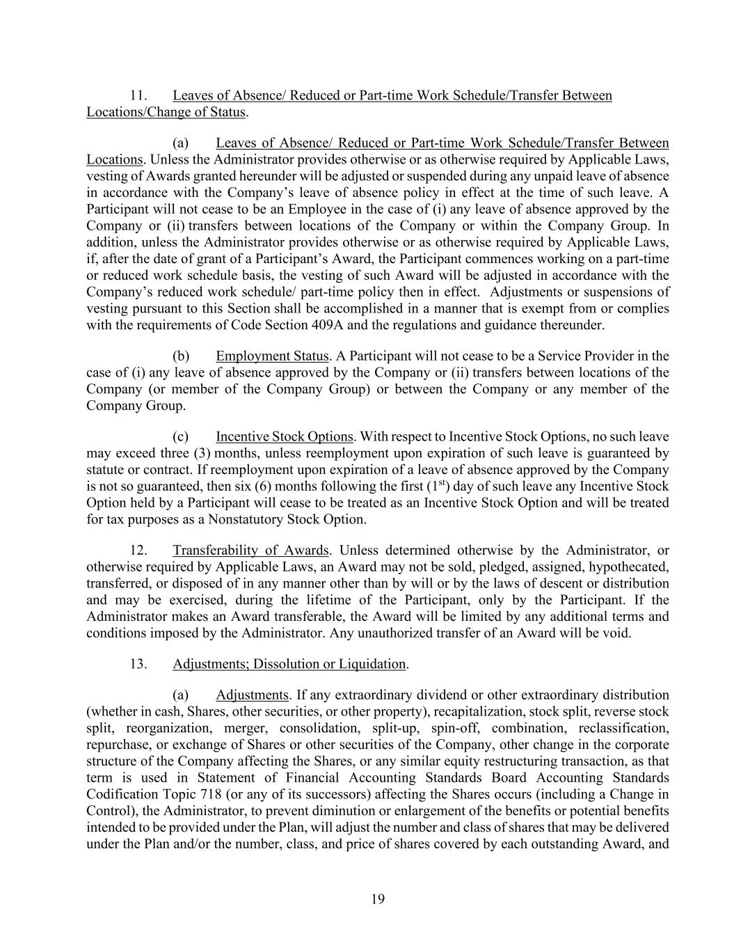 19 11. Leaves of Absence/ Reduced or Part-time Work Schedule/Transfer Between Locations/Change of Status. (a) Leaves of Absence/ Reduced or Part-time Work Schedule/Transfer Between Locations. Unless the Administrator provides otherwise or as otherwise required by Applicable Laws, vesting of Awards granted hereunder will be adjusted or suspended during any unpaid leave of absence in accordance with the Company’s leave of absence policy in effect at the time of such leave. A Participant will not cease to be an Employee in the case of (i) any leave of absence approved by the Company or (ii) transfers between locations of the Company or within the Company Group. In addition, unless the Administrator provides otherwise or as otherwise required by Applicable Laws, if, after the date of grant of a Participant’s Award, the Participant commences working on a part-time or reduced work schedule basis, the vesting of such Award will be adjusted in accordance with the Company’s reduced work schedule/ part-time policy then in effect. Adjustments or suspensions of vesting pursuant to this Section shall be accomplished in a manner that is exempt from or complies with the requirements of Code Section 409A and the regulations and guidance thereunder. (b) Employment Status. A Participant will not cease to be a Service Provider in the case of (i) any leave of absence approved by the Company or (ii) transfers between locations of the Company (or member of the Company Group) or between the Company or any member of the Company Group. (c) Incentive Stock Options. With respect to Incentive Stock Options, no such leave may exceed three (3) months, unless reemployment upon expiration of such leave is guaranteed by statute or contract. If reemployment upon expiration of a leave of absence approved by the Company is not so guaranteed, then six (6) months following the first (1st) day of such leave any Incentive Stock Option held by a Participant will cease to be treated as an Incentive Stock Option and will be treated for tax purposes as a Nonstatutory Stock Option. 12. Transferability of Awards. Unless determined otherwise by the Administrator, or otherwise required by Applicable Laws, an Award may not be sold, pledged, assigned, hypothecated, transferred, or disposed of in any manner other than by will or by the laws of descent or distribution and may be exercised, during the lifetime of the Participant, only by the Participant. If the Administrator makes an Award transferable, the Award will be limited by any additional terms and conditions imposed by the Administrator. Any unauthorized transfer of an Award will be void. 13. Adjustments; Dissolution or Liquidation. (a) Adjustments. If any extraordinary dividend or other extraordinary distribution (whether in cash, Shares, other securities, or other property), recapitalization, stock split, reverse stock split, reorganization, merger, consolidation, split-up, spin-off, combination, reclassification, repurchase, or exchange of Shares or other securities of the Company, other change in the corporate structure of the Company affecting the Shares, or any similar equity restructuring transaction, as that term is used in Statement of Financial Accounting Standards Board Accounting Standards Codification Topic 718 (or any of its successors) affecting the Shares occurs (including a Change in Control), the Administrator, to prevent diminution or enlargement of the benefits or potential benefits intended to be provided under the Plan, will adjust the number and class of shares that may be delivered under the Plan and/or the number, class, and price of shares covered by each outstanding Award, and