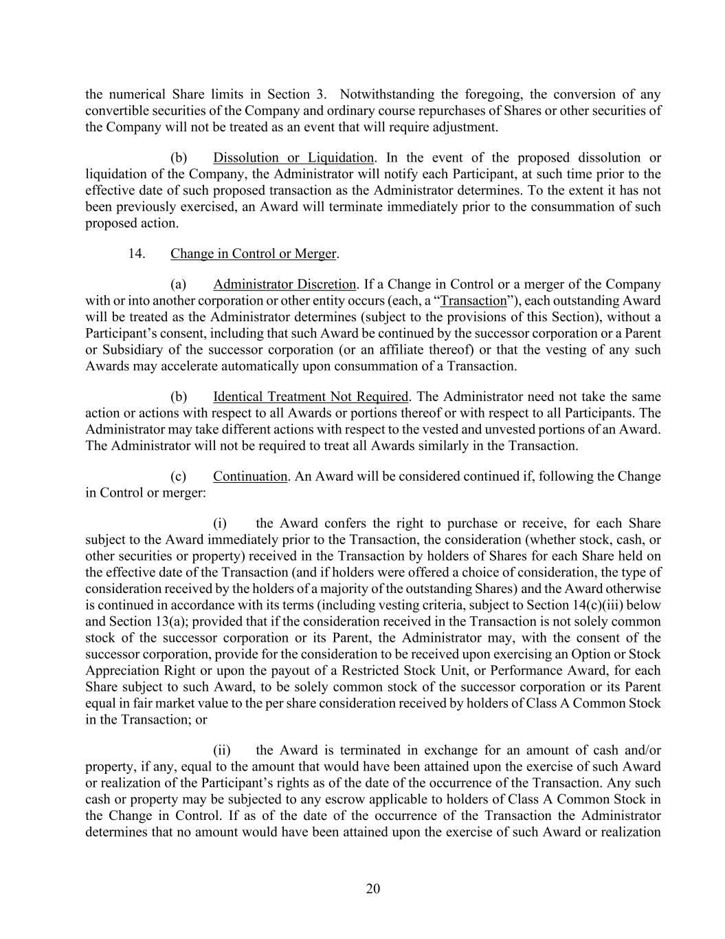 20 the numerical Share limits in Section 3. Notwithstanding the foregoing, the conversion of any convertible securities of the Company and ordinary course repurchases of Shares or other securities of the Company will not be treated as an event that will require adjustment. (b) Dissolution or Liquidation. In the event of the proposed dissolution or liquidation of the Company, the Administrator will notify each Participant, at such time prior to the effective date of such proposed transaction as the Administrator determines. To the extent it has not been previously exercised, an Award will terminate immediately prior to the consummation of such proposed action. 14. Change in Control or Merger. (a) Administrator Discretion. If a Change in Control or a merger of the Company with or into another corporation or other entity occurs (each, a “Transaction”), each outstanding Award will be treated as the Administrator determines (subject to the provisions of this Section), without a Participant’s consent, including that such Award be continued by the successor corporation or a Parent or Subsidiary of the successor corporation (or an affiliate thereof) or that the vesting of any such Awards may accelerate automatically upon consummation of a Transaction. (b) Identical Treatment Not Required. The Administrator need not take the same action or actions with respect to all Awards or portions thereof or with respect to all Participants. The Administrator may take different actions with respect to the vested and unvested portions of an Award. The Administrator will not be required to treat all Awards similarly in the Transaction. (c) Continuation. An Award will be considered continued if, following the Change in Control or merger: (i) the Award confers the right to purchase or receive, for each Share subject to the Award immediately prior to the Transaction, the consideration (whether stock, cash, or other securities or property) received in the Transaction by holders of Shares for each Share held on the effective date of the Transaction (and if holders were offered a choice of consideration, the type of consideration received by the holders of a majority of the outstanding Shares) and the Award otherwise is continued in accordance with its terms (including vesting criteria, subject to Section 14(c)(iii) below and Section 13(a); provided that if the consideration received in the Transaction is not solely common stock of the successor corporation or its Parent, the Administrator may, with the consent of the successor corporation, provide for the consideration to be received upon exercising an Option or Stock Appreciation Right or upon the payout of a Restricted Stock Unit, or Performance Award, for each Share subject to such Award, to be solely common stock of the successor corporation or its Parent equal in fair market value to the per share consideration received by holders of Class A Common Stock in the Transaction; or (ii) the Award is terminated in exchange for an amount of cash and/or property, if any, equal to the amount that would have been attained upon the exercise of such Award or realization of the Participant’s rights as of the date of the occurrence of the Transaction. Any such cash or property may be subjected to any escrow applicable to holders of Class A Common Stock in the Change in Control. If as of the date of the occurrence of the Transaction the Administrator determines that no amount would have been attained upon the exercise of such Award or realization