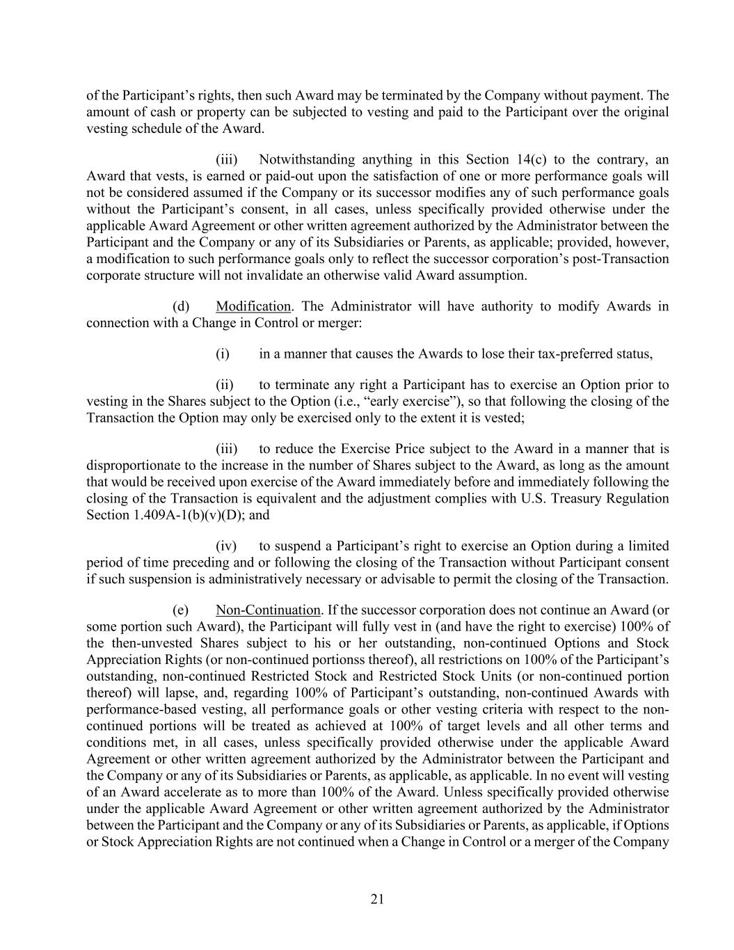 21 of the Participant’s rights, then such Award may be terminated by the Company without payment. The amount of cash or property can be subjected to vesting and paid to the Participant over the original vesting schedule of the Award. (iii) Notwithstanding anything in this Section 14(c) to the contrary, an Award that vests, is earned or paid-out upon the satisfaction of one or more performance goals will not be considered assumed if the Company or its successor modifies any of such performance goals without the Participant’s consent, in all cases, unless specifically provided otherwise under the applicable Award Agreement or other written agreement authorized by the Administrator between the Participant and the Company or any of its Subsidiaries or Parents, as applicable; provided, however, a modification to such performance goals only to reflect the successor corporation’s post-Transaction corporate structure will not invalidate an otherwise valid Award assumption. (d) Modification. The Administrator will have authority to modify Awards in connection with a Change in Control or merger: (i) in a manner that causes the Awards to lose their tax-preferred status, (ii) to terminate any right a Participant has to exercise an Option prior to vesting in the Shares subject to the Option (i.e., “early exercise”), so that following the closing of the Transaction the Option may only be exercised only to the extent it is vested; (iii) to reduce the Exercise Price subject to the Award in a manner that is disproportionate to the increase in the number of Shares subject to the Award, as long as the amount that would be received upon exercise of the Award immediately before and immediately following the closing of the Transaction is equivalent and the adjustment complies with U.S. Treasury Regulation Section 1.409A-1(b)(v)(D); and (iv) to suspend a Participant’s right to exercise an Option during a limited period of time preceding and or following the closing of the Transaction without Participant consent if such suspension is administratively necessary or advisable to permit the closing of the Transaction. (e) Non-Continuation. If the successor corporation does not continue an Award (or some portion such Award), the Participant will fully vest in (and have the right to exercise) 100% of the then-unvested Shares subject to his or her outstanding, non-continued Options and Stock Appreciation Rights (or non-continued portionss thereof), all restrictions on 100% of the Participant’s outstanding, non-continued Restricted Stock and Restricted Stock Units (or non-continued portion thereof) will lapse, and, regarding 100% of Participant’s outstanding, non-continued Awards with performance-based vesting, all performance goals or other vesting criteria with respect to the non- continued portions will be treated as achieved at 100% of target levels and all other terms and conditions met, in all cases, unless specifically provided otherwise under the applicable Award Agreement or other written agreement authorized by the Administrator between the Participant and the Company or any of its Subsidiaries or Parents, as applicable, as applicable. In no event will vesting of an Award accelerate as to more than 100% of the Award. Unless specifically provided otherwise under the applicable Award Agreement or other written agreement authorized by the Administrator between the Participant and the Company or any of its Subsidiaries or Parents, as applicable, if Options or Stock Appreciation Rights are not continued when a Change in Control or a merger of the Company