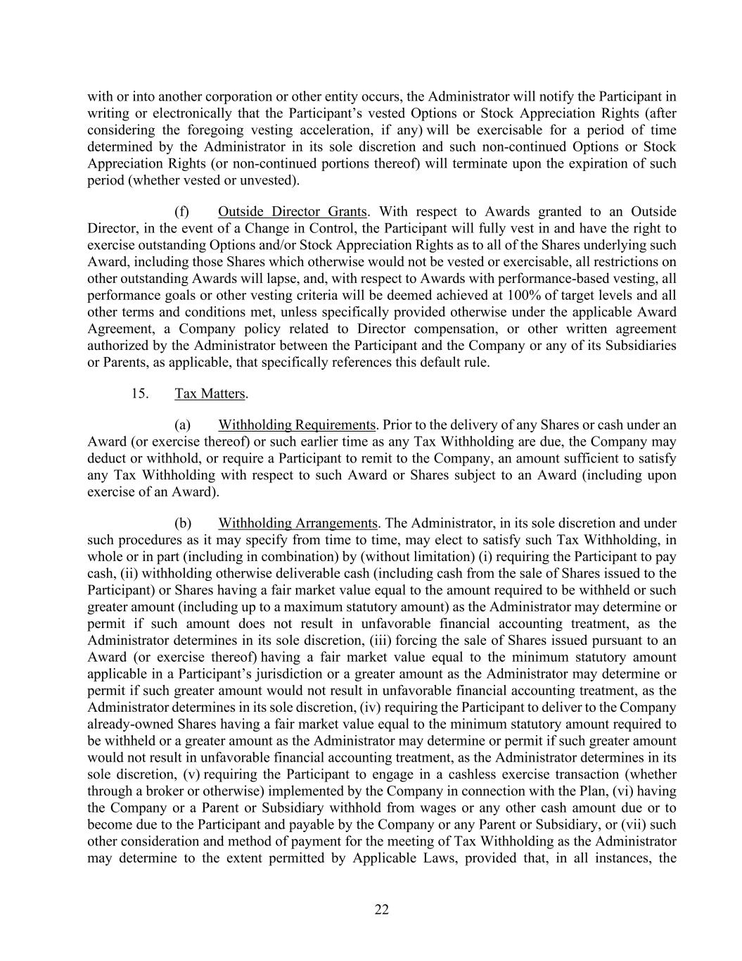 22 with or into another corporation or other entity occurs, the Administrator will notify the Participant in writing or electronically that the Participant’s vested Options or Stock Appreciation Rights (after considering the foregoing vesting acceleration, if any) will be exercisable for a period of time determined by the Administrator in its sole discretion and such non-continued Options or Stock Appreciation Rights (or non-continued portions thereof) will terminate upon the expiration of such period (whether vested or unvested). (f) Outside Director Grants. With respect to Awards granted to an Outside Director, in the event of a Change in Control, the Participant will fully vest in and have the right to exercise outstanding Options and/or Stock Appreciation Rights as to all of the Shares underlying such Award, including those Shares which otherwise would not be vested or exercisable, all restrictions on other outstanding Awards will lapse, and, with respect to Awards with performance-based vesting, all performance goals or other vesting criteria will be deemed achieved at 100% of target levels and all other terms and conditions met, unless specifically provided otherwise under the applicable Award Agreement, a Company policy related to Director compensation, or other written agreement authorized by the Administrator between the Participant and the Company or any of its Subsidiaries or Parents, as applicable, that specifically references this default rule. 15. Tax Matters. (a) Withholding Requirements. Prior to the delivery of any Shares or cash under an Award (or exercise thereof) or such earlier time as any Tax Withholding are due, the Company may deduct or withhold, or require a Participant to remit to the Company, an amount sufficient to satisfy any Tax Withholding with respect to such Award or Shares subject to an Award (including upon exercise of an Award). (b) Withholding Arrangements. The Administrator, in its sole discretion and under such procedures as it may specify from time to time, may elect to satisfy such Tax Withholding, in whole or in part (including in combination) by (without limitation) (i) requiring the Participant to pay cash, (ii) withholding otherwise deliverable cash (including cash from the sale of Shares issued to the Participant) or Shares having a fair market value equal to the amount required to be withheld or such greater amount (including up to a maximum statutory amount) as the Administrator may determine or permit if such amount does not result in unfavorable financial accounting treatment, as the Administrator determines in its sole discretion, (iii) forcing the sale of Shares issued pursuant to an Award (or exercise thereof) having a fair market value equal to the minimum statutory amount applicable in a Participant’s jurisdiction or a greater amount as the Administrator may determine or permit if such greater amount would not result in unfavorable financial accounting treatment, as the Administrator determines in its sole discretion, (iv) requiring the Participant to deliver to the Company already-owned Shares having a fair market value equal to the minimum statutory amount required to be withheld or a greater amount as the Administrator may determine or permit if such greater amount would not result in unfavorable financial accounting treatment, as the Administrator determines in its sole discretion, (v) requiring the Participant to engage in a cashless exercise transaction (whether through a broker or otherwise) implemented by the Company in connection with the Plan, (vi) having the Company or a Parent or Subsidiary withhold from wages or any other cash amount due or to become due to the Participant and payable by the Company or any Parent or Subsidiary, or (vii) such other consideration and method of payment for the meeting of Tax Withholding as the Administrator may determine to the extent permitted by Applicable Laws, provided that, in all instances, the