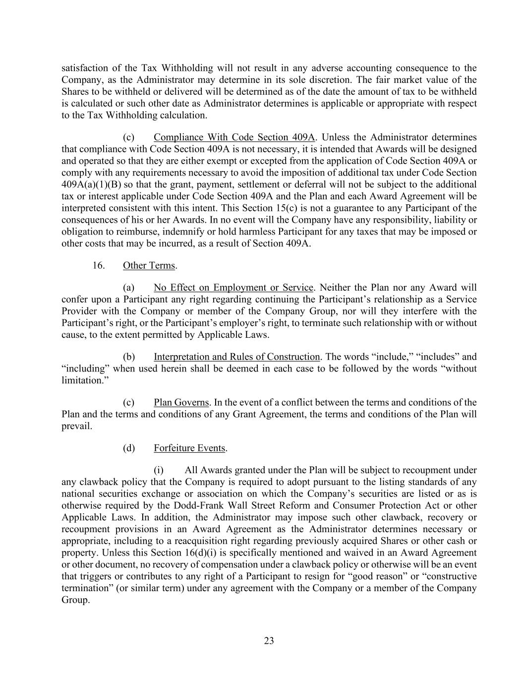 23 satisfaction of the Tax Withholding will not result in any adverse accounting consequence to the Company, as the Administrator may determine in its sole discretion. The fair market value of the Shares to be withheld or delivered will be determined as of the date the amount of tax to be withheld is calculated or such other date as Administrator determines is applicable or appropriate with respect to the Tax Withholding calculation. (c) Compliance With Code Section 409A. Unless the Administrator determines that compliance with Code Section 409A is not necessary, it is intended that Awards will be designed and operated so that they are either exempt or excepted from the application of Code Section 409A or comply with any requirements necessary to avoid the imposition of additional tax under Code Section 409A(a)(1)(B) so that the grant, payment, settlement or deferral will not be subject to the additional tax or interest applicable under Code Section 409A and the Plan and each Award Agreement will be interpreted consistent with this intent. This Section 15(c) is not a guarantee to any Participant of the consequences of his or her Awards. In no event will the Company have any responsibility, liability or obligation to reimburse, indemnify or hold harmless Participant for any taxes that may be imposed or other costs that may be incurred, as a result of Section 409A. 16. Other Terms. (a) No Effect on Employment or Service. Neither the Plan nor any Award will confer upon a Participant any right regarding continuing the Participant’s relationship as a Service Provider with the Company or member of the Company Group, nor will they interfere with the Participant’s right, or the Participant’s employer’s right, to terminate such relationship with or without cause, to the extent permitted by Applicable Laws. (b) Interpretation and Rules of Construction. The words “include,” “includes” and “including” when used herein shall be deemed in each case to be followed by the words “without limitation.” (c) Plan Governs. In the event of a conflict between the terms and conditions of the Plan and the terms and conditions of any Grant Agreement, the terms and conditions of the Plan will prevail. (d) Forfeiture Events. (i) All Awards granted under the Plan will be subject to recoupment under any clawback policy that the Company is required to adopt pursuant to the listing standards of any national securities exchange or association on which the Company’s securities are listed or as is otherwise required by the Dodd-Frank Wall Street Reform and Consumer Protection Act or other Applicable Laws. In addition, the Administrator may impose such other clawback, recovery or recoupment provisions in an Award Agreement as the Administrator determines necessary or appropriate, including to a reacquisition right regarding previously acquired Shares or other cash or property. Unless this Section 16(d)(i) is specifically mentioned and waived in an Award Agreement or other document, no recovery of compensation under a clawback policy or otherwise will be an event that triggers or contributes to any right of a Participant to resign for “good reason” or “constructive termination” (or similar term) under any agreement with the Company or a member of the Company Group.