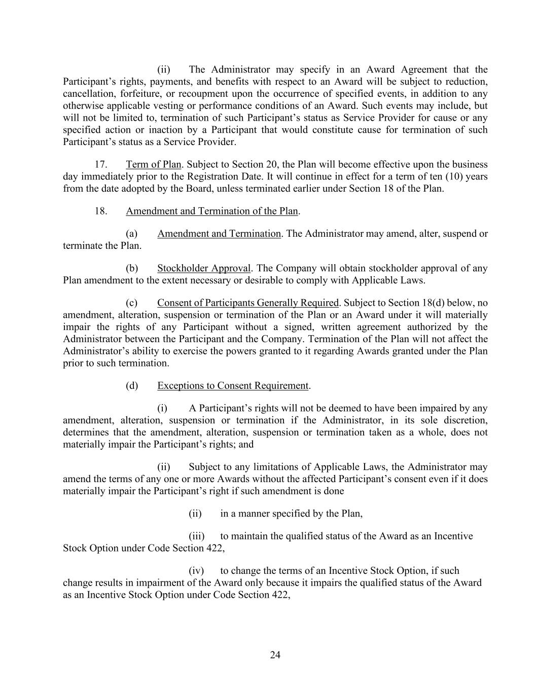 24 (ii) The Administrator may specify in an Award Agreement that the Participant’s rights, payments, and benefits with respect to an Award will be subject to reduction, cancellation, forfeiture, or recoupment upon the occurrence of specified events, in addition to any otherwise applicable vesting or performance conditions of an Award. Such events may include, but will not be limited to, termination of such Participant’s status as Service Provider for cause or any specified action or inaction by a Participant that would constitute cause for termination of such Participant’s status as a Service Provider. 17. Term of Plan. Subject to Section 20, the Plan will become effective upon the business day immediately prior to the Registration Date. It will continue in effect for a term of ten (10) years from the date adopted by the Board, unless terminated earlier under Section 18 of the Plan. 18. Amendment and Termination of the Plan. (a) Amendment and Termination. The Administrator may amend, alter, suspend or terminate the Plan. (b) Stockholder Approval. The Company will obtain stockholder approval of any Plan amendment to the extent necessary or desirable to comply with Applicable Laws. (c) Consent of Participants Generally Required. Subject to Section 18(d) below, no amendment, alteration, suspension or termination of the Plan or an Award under it will materially impair the rights of any Participant without a signed, written agreement authorized by the Administrator between the Participant and the Company. Termination of the Plan will not affect the Administrator’s ability to exercise the powers granted to it regarding Awards granted under the Plan prior to such termination. (d) Exceptions to Consent Requirement. (i) A Participant’s rights will not be deemed to have been impaired by any amendment, alteration, suspension or termination if the Administrator, in its sole discretion, determines that the amendment, alteration, suspension or termination taken as a whole, does not materially impair the Participant’s rights; and (ii) Subject to any limitations of Applicable Laws, the Administrator may amend the terms of any one or more Awards without the affected Participant’s consent even if it does materially impair the Participant’s right if such amendment is done (ii) in a manner specified by the Plan, (iii) to maintain the qualified status of the Award as an Incentive Stock Option under Code Section 422, (iv) to change the terms of an Incentive Stock Option, if such change results in impairment of the Award only because it impairs the qualified status of the Award as an Incentive Stock Option under Code Section 422,