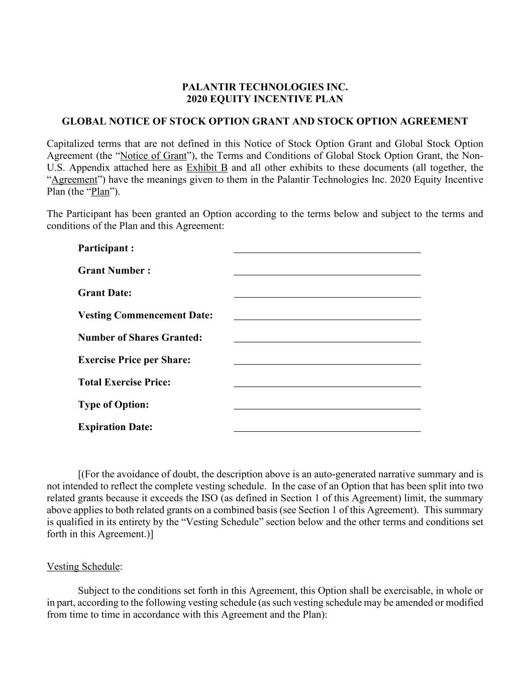 PALANTIR TECHNOLOGIES INC. 2020 EQUITY INCENTIVE PLAN GLOBAL NOTICE OF STOCK OPTION GRANT AND STOCK OPTION AGREEMENT Capitalized terms that are not defined in this Notice of Stock Option Grant and Global Stock Option Agreement (the “Notice of Grant”), the Terms and Conditions of Global Stock Option Grant, the Non- U.S. Appendix attached here as Exhibit B and all other exhibits to these documents (all together, the “Agreement”) have the meanings given to them in the Palantir Technologies Inc. 2020 Equity Incentive Plan (the “Plan”). The Participant has been granted an Option according to the terms below and subject to the terms and conditions of the Plan and this Agreement: Participant : Grant Number : Grant Date: Vesting Commencement Date: Number of Shares Granted: Exercise Price per Share: Total Exercise Price: Type of Option: Expiration Date: [(For the avoidance of doubt, the description above is an auto-generated narrative summary and is not intended to reflect the complete vesting schedule. In the case of an Option that has been split into two related grants because it exceeds the ISO (as defined in Section 1 of this Agreement) limit, the summary above applies to both related grants on a combined basis (see Section 1 of this Agreement). This summary is qualified in its entirety by the “Vesting Schedule” section below and the other terms and conditions set forth in this Agreement.)] Vesting Schedule: Subject to the conditions set forth in this Agreement, this Option shall be exercisable, in whole or in part, according to the following vesting schedule (as such vesting schedule may be amended or modified from time to time in accordance with this Agreement and the Plan):