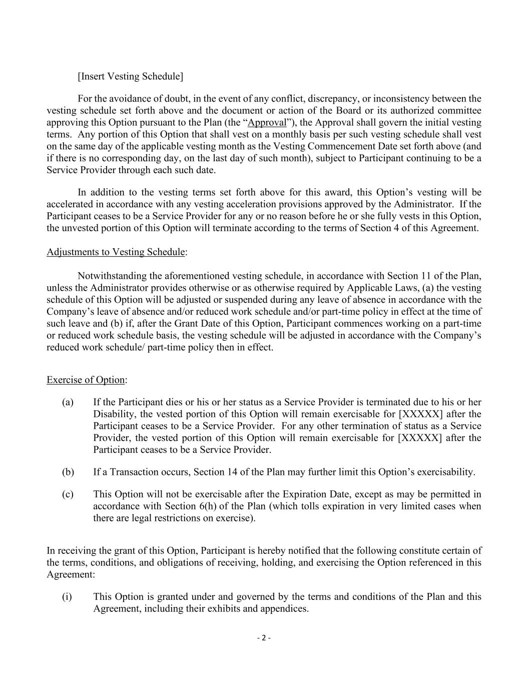 - 2 - [Insert Vesting Schedule] For the avoidance of doubt, in the event of any conflict, discrepancy, or inconsistency between the vesting schedule set forth above and the document or action of the Board or its authorized committee approving this Option pursuant to the Plan (the “Approval”), the Approval shall govern the initial vesting terms. Any portion of this Option that shall vest on a monthly basis per such vesting schedule shall vest on the same day of the applicable vesting month as the Vesting Commencement Date set forth above (and if there is no corresponding day, on the last day of such month), subject to Participant continuing to be a Service Provider through each such date. In addition to the vesting terms set forth above for this award, this Option’s vesting will be accelerated in accordance with any vesting acceleration provisions approved by the Administrator. If the Participant ceases to be a Service Provider for any or no reason before he or she fully vests in this Option, the unvested portion of this Option will terminate according to the terms of Section 4 of this Agreement. Adjustments to Vesting Schedule: Notwithstanding the aforementioned vesting schedule, in accordance with Section 11 of the Plan, unless the Administrator provides otherwise or as otherwise required by Applicable Laws, (a) the vesting schedule of this Option will be adjusted or suspended during any leave of absence in accordance with the Company’s leave of absence and/or reduced work schedule and/or part-time policy in effect at the time of such leave and (b) if, after the Grant Date of this Option, Participant commences working on a part-time or reduced work schedule basis, the vesting schedule will be adjusted in accordance with the Company’s reduced work schedule/ part-time policy then in effect. Exercise of Option: (a) If the Participant dies or his or her status as a Service Provider is terminated due to his or her Disability, the vested portion of this Option will remain exercisable for [XXXXX] after the Participant ceases to be a Service Provider. For any other termination of status as a Service Provider, the vested portion of this Option will remain exercisable for [XXXXX] after the Participant ceases to be a Service Provider. (b) If a Transaction occurs, Section 14 of the Plan may further limit this Option’s exercisability. (c) This Option will not be exercisable after the Expiration Date, except as may be permitted in accordance with Section 6(h) of the Plan (which tolls expiration in very limited cases when there are legal restrictions on exercise). In receiving the grant of this Option, Participant is hereby notified that the following constitute certain of the terms, conditions, and obligations of receiving, holding, and exercising the Option referenced in this Agreement: (i) This Option is granted under and governed by the terms and conditions of the Plan and this Agreement, including their exhibits and appendices.