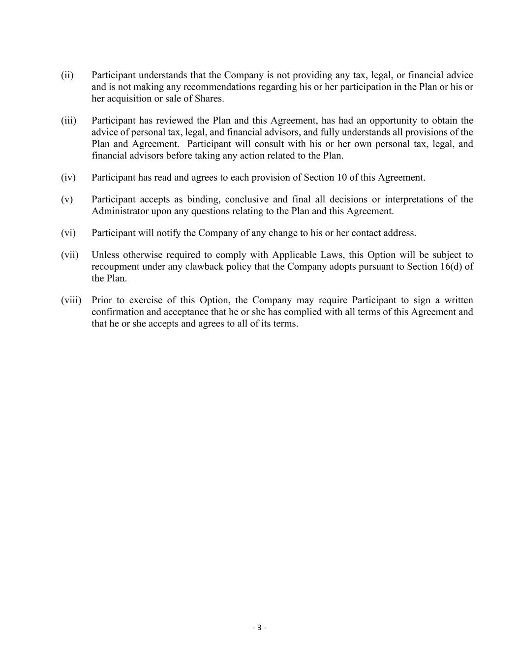 - 3 - (ii) Participant understands that the Company is not providing any tax, legal, or financial advice and is not making any recommendations regarding his or her participation in the Plan or his or her acquisition or sale of Shares. (iii) Participant has reviewed the Plan and this Agreement, has had an opportunity to obtain the advice of personal tax, legal, and financial advisors, and fully understands all provisions of the Plan and Agreement. Participant will consult with his or her own personal tax, legal, and financial advisors before taking any action related to the Plan. (iv) Participant has read and agrees to each provision of Section 10 of this Agreement. (v) Participant accepts as binding, conclusive and final all decisions or interpretations of the Administrator upon any questions relating to the Plan and this Agreement. (vi) Participant will notify the Company of any change to his or her contact address. (vii) Unless otherwise required to comply with Applicable Laws, this Option will be subject to recoupment under any clawback policy that the Company adopts pursuant to Section 16(d) of the Plan. (viii) Prior to exercise of this Option, the Company may require Participant to sign a written confirmation and acceptance that he or she has complied with all terms of this Agreement and that he or she accepts and agrees to all of its terms.