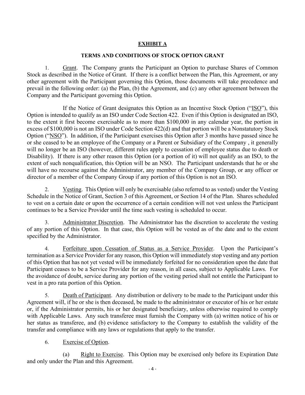 - 4 - EXHIBIT A TERMS AND CONDITIONS OF STOCK OPTION GRANT 1. Grant. The Company grants the Participant an Option to purchase Shares of Common Stock as described in the Notice of Grant. If there is a conflict between the Plan, this Agreement, or any other agreement with the Participant governing this Option, those documents will take precedence and prevail in the following order: (a) the Plan, (b) the Agreement, and (c) any other agreement between the Company and the Participant governing this Option. If the Notice of Grant designates this Option as an Incentive Stock Option (“ISO”), this Option is intended to qualify as an ISO under Code Section 422. Even if this Option is designated an ISO, to the extent it first become exercisable as to more than $100,000 in any calendar year, the portion in excess of $100,000 is not an ISO under Code Section 422(d) and that portion will be a Nonstatutory Stock Option (“NSO”). In addition, if the Participant exercises this Option after 3 months have passed since he or she ceased to be an employee of the Company or a Parent or Subsidiary of the Company , it generally will no longer be an ISO (however, different rules apply to cessation of employee status due to death or Disability). If there is any other reason this Option (or a portion of it) will not qualify as an ISO, to the extent of such nonqualification, this Option will be an NSO. The Participant understands that he or she will have no recourse against the Administrator, any member of the Company Group, or any officer or director of a member of the Company Group if any portion of this Option is not an ISO. 2. Vesting. This Option will only be exercisable (also referred to as vested) under the Vesting Schedule in the Notice of Grant, Section 3 of this Agreement, or Section 14 of the Plan. Shares scheduled to vest on a certain date or upon the occurrence of a certain condition will not vest unless the Participant continues to be a Service Provider until the time such vesting is scheduled to occur. 3. Administrator Discretion. The Administrator has the discretion to accelerate the vesting of any portion of this Option. In that case, this Option will be vested as of the date and to the extent specified by the Administrator. 4. Forfeiture upon Cessation of Status as a Service Provider. Upon the Participant’s termination as a Service Provider for any reason, this Option will immediately stop vesting and any portion of this Option that has not yet vested will be immediately forfeited for no consideration upon the date that Participant ceases to be a Service Provider for any reason, in all cases, subject to Applicable Laws. For the avoidance of doubt, service during any portion of the vesting period shall not entitle the Participant to vest in a pro rata portion of this Option. 5. Death of Participant. Any distribution or delivery to be made to the Participant under this Agreement will, if he or she is then deceased, be made to the administrator or executor of his or her estate or, if the Administrator permits, his or her designated beneficiary, unless otherwise required to comply with Applicable Laws. Any such transferee must furnish the Company with (a) written notice of his or her status as transferee, and (b) evidence satisfactory to the Company to establish the validity of the transfer and compliance with any laws or regulations that apply to the transfer. 6. Exercise of Option. (a) Right to Exercise. This Option may be exercised only before its Expiration Date and only under the Plan and this Agreement.