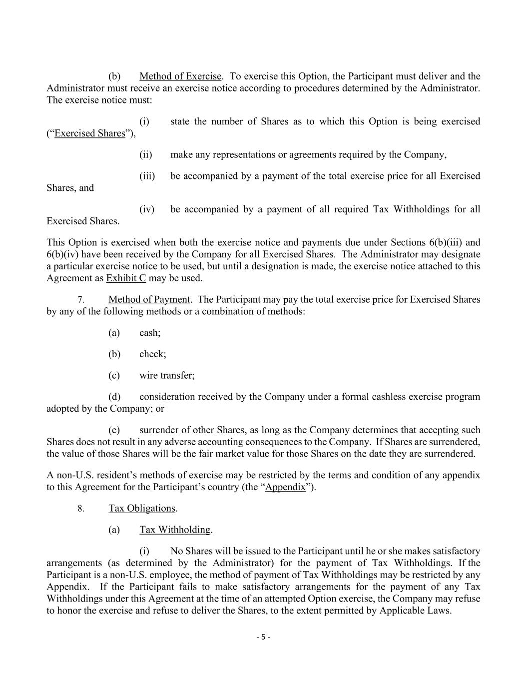 - 5 - (b) Method of Exercise. To exercise this Option, the Participant must deliver and the Administrator must receive an exercise notice according to procedures determined by the Administrator. The exercise notice must: (i) state the number of Shares as to which this Option is being exercised (“Exercised Shares”), (ii) make any representations or agreements required by the Company, (iii) be accompanied by a payment of the total exercise price for all Exercised Shares, and (iv) be accompanied by a payment of all required Tax Withholdings for all Exercised Shares. This Option is exercised when both the exercise notice and payments due under Sections 6(b)(iii) and 6(b)(iv) have been received by the Company for all Exercised Shares. The Administrator may designate a particular exercise notice to be used, but until a designation is made, the exercise notice attached to this Agreement as Exhibit C may be used. 7. Method of Payment. The Participant may pay the total exercise price for Exercised Shares by any of the following methods or a combination of methods: (a) cash; (b) check; (c) wire transfer; (d) consideration received by the Company under a formal cashless exercise program adopted by the Company; or (e) surrender of other Shares, as long as the Company determines that accepting such Shares does not result in any adverse accounting consequences to the Company. If Shares are surrendered, the value of those Shares will be the fair market value for those Shares on the date they are surrendered. A non-U.S. resident’s methods of exercise may be restricted by the terms and condition of any appendix to this Agreement for the Participant’s country (the “Appendix”). 8. Tax Obligations. (a) Tax Withholding. (i) No Shares will be issued to the Participant until he or she makes satisfactory arrangements (as determined by the Administrator) for the payment of Tax Withholdings. If the Participant is a non-U.S. employee, the method of payment of Tax Withholdings may be restricted by any Appendix. If the Participant fails to make satisfactory arrangements for the payment of any Tax Withholdings under this Agreement at the time of an attempted Option exercise, the Company may refuse to honor the exercise and refuse to deliver the Shares, to the extent permitted by Applicable Laws.