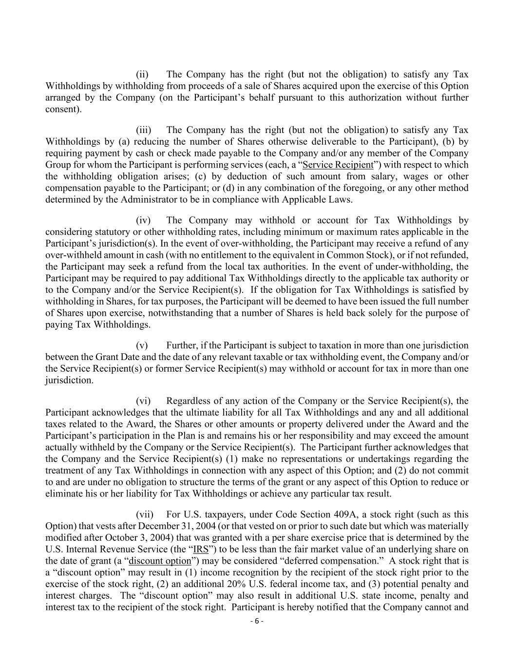 - 6 - (ii) The Company has the right (but not the obligation) to satisfy any Tax Withholdings by withholding from proceeds of a sale of Shares acquired upon the exercise of this Option arranged by the Company (on the Participant’s behalf pursuant to this authorization without further consent). (iii) The Company has the right (but not the obligation) to satisfy any Tax Withholdings by (a) reducing the number of Shares otherwise deliverable to the Participant), (b) by requiring payment by cash or check made payable to the Company and/or any member of the Company Group for whom the Participant is performing services (each, a “Service Recipient”) with respect to which the withholding obligation arises; (c) by deduction of such amount from salary, wages or other compensation payable to the Participant; or (d) in any combination of the foregoing, or any other method determined by the Administrator to be in compliance with Applicable Laws. (iv) The Company may withhold or account for Tax Withholdings by considering statutory or other withholding rates, including minimum or maximum rates applicable in the Participant’s jurisdiction(s). In the event of over-withholding, the Participant may receive a refund of any over-withheld amount in cash (with no entitlement to the equivalent in Common Stock), or if not refunded, the Participant may seek a refund from the local tax authorities. In the event of under-withholding, the Participant may be required to pay additional Tax Withholdings directly to the applicable tax authority or to the Company and/or the Service Recipient(s). If the obligation for Tax Withholdings is satisfied by withholding in Shares, for tax purposes, the Participant will be deemed to have been issued the full number of Shares upon exercise, notwithstanding that a number of Shares is held back solely for the purpose of paying Tax Withholdings. (v) Further, if the Participant is subject to taxation in more than one jurisdiction between the Grant Date and the date of any relevant taxable or tax withholding event, the Company and/or the Service Recipient(s) or former Service Recipient(s) may withhold or account for tax in more than one jurisdiction. (vi) Regardless of any action of the Company or the Service Recipient(s), the Participant acknowledges that the ultimate liability for all Tax Withholdings and any and all additional taxes related to the Award, the Shares or other amounts or property delivered under the Award and the Participant’s participation in the Plan is and remains his or her responsibility and may exceed the amount actually withheld by the Company or the Service Recipient(s). The Participant further acknowledges that the Company and the Service Recipient(s) (1) make no representations or undertakings regarding the treatment of any Tax Withholdings in connection with any aspect of this Option; and (2) do not commit to and are under no obligation to structure the terms of the grant or any aspect of this Option to reduce or eliminate his or her liability for Tax Withholdings or achieve any particular tax result. (vii) For U.S. taxpayers, under Code Section 409A, a stock right (such as this Option) that vests after December 31, 2004 (or that vested on or prior to such date but which was materially modified after October 3, 2004) that was granted with a per share exercise price that is determined by the U.S. Internal Revenue Service (the “IRS”) to be less than the fair market value of an underlying share on the date of grant (a “discount option”) may be considered “deferred compensation.” A stock right that is a “discount option” may result in (1) income recognition by the recipient of the stock right prior to the exercise of the stock right, (2) an additional 20% U.S. federal income tax, and (3) potential penalty and interest charges. The “discount option” may also result in additional U.S. state income, penalty and interest tax to the recipient of the stock right. Participant is hereby notified that the Company cannot and