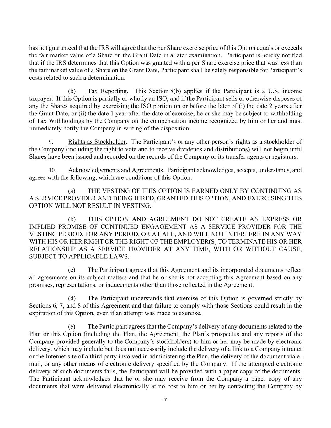 - 7 - has not guaranteed that the IRS will agree that the per Share exercise price of this Option equals or exceeds the fair market value of a Share on the Grant Date in a later examination. Participant is hereby notified that if the IRS determines that this Option was granted with a per Share exercise price that was less than the fair market value of a Share on the Grant Date, Participant shall be solely responsible for Participant’s costs related to such a determination. (b) Tax Reporting. This Section 8(b) applies if the Participant is a U.S. income taxpayer. If this Option is partially or wholly an ISO, and if the Participant sells or otherwise disposes of any the Shares acquired by exercising the ISO portion on or before the later of (i) the date 2 years after the Grant Date, or (ii) the date 1 year after the date of exercise, he or she may be subject to withholding of Tax Withholdings by the Company on the compensation income recognized by him or her and must immediately notify the Company in writing of the disposition. 9. Rights as Stockholder. The Participant’s or any other person’s rights as a stockholder of the Company (including the right to vote and to receive dividends and distributions) will not begin until Shares have been issued and recorded on the records of the Company or its transfer agents or registrars. 10. Acknowledgements and Agreements. Participant acknowledges, accepts, understands, and agrees with the following, which are conditions of this Option: (a) THE VESTING OF THIS OPTION IS EARNED ONLY BY CONTINUING AS A SERVICE PROVIDER AND BEING HIRED, GRANTED THIS OPTION, AND EXERCISING THIS OPTION WILL NOT RESULT IN VESTING. (b) THIS OPTION AND AGREEMENT DO NOT CREATE AN EXPRESS OR IMPLIED PROMISE OF CONTINUED ENGAGEMENT AS A SERVICE PROVIDER FOR THE VESTING PERIOD, FOR ANY PERIOD, OR AT ALL, AND WILL NOT INTERFERE IN ANY WAY WITH HIS OR HER RIGHT OR THE RIGHT OF THE EMPLOYER(S) TO TERMINATE HIS OR HER RELATIONSHIP AS A SERVICE PROVIDER AT ANY TIME, WITH OR WITHOUT CAUSE, SUBJECT TO APPLICABLE LAWS. (c) The Participant agrees that this Agreement and its incorporated documents reflect all agreements on its subject matters and that he or she is not accepting this Agreement based on any promises, representations, or inducements other than those reflected in the Agreement. (d) The Participant understands that exercise of this Option is governed strictly by Sections 6, 7, and 8 of this Agreement and that failure to comply with those Sections could result in the expiration of this Option, even if an attempt was made to exercise. (e) The Participant agrees that the Company’s delivery of any documents related to the Plan or this Option (including the Plan, the Agreement, the Plan’s prospectus and any reports of the Company provided generally to the Company’s stockholders) to him or her may be made by electronic delivery, which may include but does not necessarily include the delivery of a link to a Company intranet or the Internet site of a third party involved in administering the Plan, the delivery of the document via e- mail, or any other means of electronic delivery specified by the Company. If the attempted electronic delivery of such documents fails, the Participant will be provided with a paper copy of the documents. The Participant acknowledges that he or she may receive from the Company a paper copy of any documents that were delivered electronically at no cost to him or her by contacting the Company by