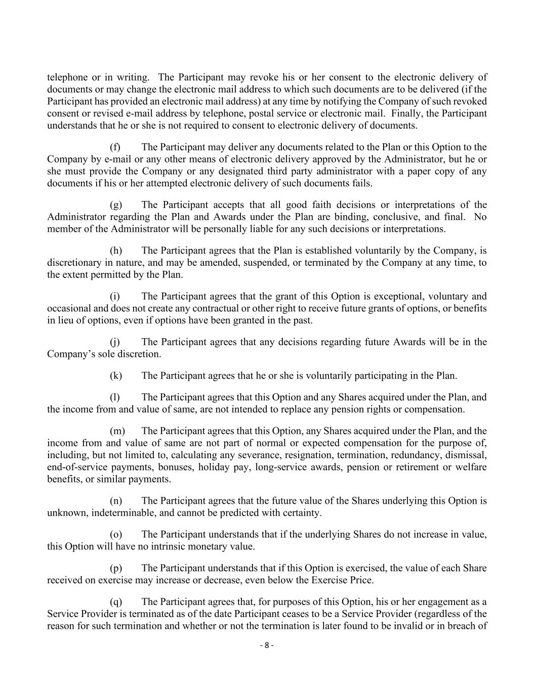 - 8 - telephone or in writing. The Participant may revoke his or her consent to the electronic delivery of documents or may change the electronic mail address to which such documents are to be delivered (if the Participant has provided an electronic mail address) at any time by notifying the Company of such revoked consent or revised e-mail address by telephone, postal service or electronic mail. Finally, the Participant understands that he or she is not required to consent to electronic delivery of documents. (f) The Participant may deliver any documents related to the Plan or this Option to the Company by e-mail or any other means of electronic delivery approved by the Administrator, but he or she must provide the Company or any designated third party administrator with a paper copy of any documents if his or her attempted electronic delivery of such documents fails. (g) The Participant accepts that all good faith decisions or interpretations of the Administrator regarding the Plan and Awards under the Plan are binding, conclusive, and final. No member of the Administrator will be personally liable for any such decisions or interpretations. (h) The Participant agrees that the Plan is established voluntarily by the Company, is discretionary in nature, and may be amended, suspended, or terminated by the Company at any time, to the extent permitted by the Plan. (i) The Participant agrees that the grant of this Option is exceptional, voluntary and occasional and does not create any contractual or other right to receive future grants of options, or benefits in lieu of options, even if options have been granted in the past. (j) The Participant agrees that any decisions regarding future Awards will be in the Company’s sole discretion. (k) The Participant agrees that he or she is voluntarily participating in the Plan. (l) The Participant agrees that this Option and any Shares acquired under the Plan, and the income from and value of same, are not intended to replace any pension rights or compensation. (m) The Participant agrees that this Option, any Shares acquired under the Plan, and the income from and value of same are not part of normal or expected compensation for the purpose of, including, but not limited to, calculating any severance, resignation, termination, redundancy, dismissal, end-of-service payments, bonuses, holiday pay, long-service awards, pension or retirement or welfare benefits, or similar payments. (n) The Participant agrees that the future value of the Shares underlying this Option is unknown, indeterminable, and cannot be predicted with certainty. (o) The Participant understands that if the underlying Shares do not increase in value, this Option will have no intrinsic monetary value. (p) The Participant understands that if this Option is exercised, the value of each Share received on exercise may increase or decrease, even below the Exercise Price. (q) The Participant agrees that, for purposes of this Option, his or her engagement as a Service Provider is terminated as of the date Participant ceases to be a Service Provider (regardless of the reason for such termination and whether or not the termination is later found to be invalid or in breach of