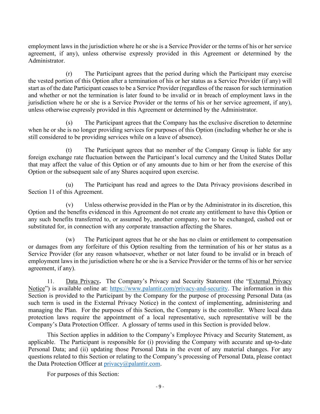 - 9 - employment laws in the jurisdiction where he or she is a Service Provider or the terms of his or her service agreement, if any), unless otherwise expressly provided in this Agreement or determined by the Administrator. (r) The Participant agrees that the period during which the Participant may exercise the vested portion of this Option after a termination of his or her status as a Service Provider (if any) will start as of the date Participant ceases to be a Service Provider (regardless of the reason for such termination and whether or not the termination is later found to be invalid or in breach of employment laws in the jurisdiction where he or she is a Service Provider or the terms of his or her service agreement, if any), unless otherwise expressly provided in this Agreement or determined by the Administrator. (s) The Participant agrees that the Company has the exclusive discretion to determine when he or she is no longer providing services for purposes of this Option (including whether he or she is still considered to be providing services while on a leave of absence). (t) The Participant agrees that no member of the Company Group is liable for any foreign exchange rate fluctuation between the Participant’s local currency and the United States Dollar that may affect the value of this Option or of any amounts due to him or her from the exercise of this Option or the subsequent sale of any Shares acquired upon exercise. (u) The Participant has read and agrees to the Data Privacy provisions described in Section 11 of this Agreement. (v) Unless otherwise provided in the Plan or by the Administrator in its discretion, this Option and the benefits evidenced in this Agreement do not create any entitlement to have this Option or any such benefits transferred to, or assumed by, another company, nor to be exchanged, cashed out or substituted for, in connection with any corporate transaction affecting the Shares. (w) The Participant agrees that he or she has no claim or entitlement to compensation or damages from any forfeiture of this Option resulting from the termination of his or her status as a Service Provider (for any reason whatsoever, whether or not later found to be invalid or in breach of employment laws in the jurisdiction where he or she is a Service Provider or the terms of his or her service agreement, if any). 11. Data Privacy. The Company’s Privacy and Security Statement (the “External Privacy Notice”) is available online at: https://www.palantir.com/privacy-and-security. The information in this Section is provided to the Participant by the Company for the purpose of processing Personal Data (as such term is used in the External Privacy Notice) in the context of implementing, administering and managing the Plan. For the purposes of this Section, the Company is the controller. Where local data protection laws require the appointment of a local representative, such representative will be the Company’s Data Protection Officer. A glossary of terms used in this Section is provided below. This Section applies in addition to the Company’s Employee Privacy and Security Statement, as applicable. The Participant is responsible for (i) providing the Company with accurate and up-to-date Personal Data; and (ii) updating those Personal Data in the event of any material changes. For any questions related to this Section or relating to the Company’s processing of Personal Data, please contact the Data Protection Officer at [email protected]. For purposes of this Section: