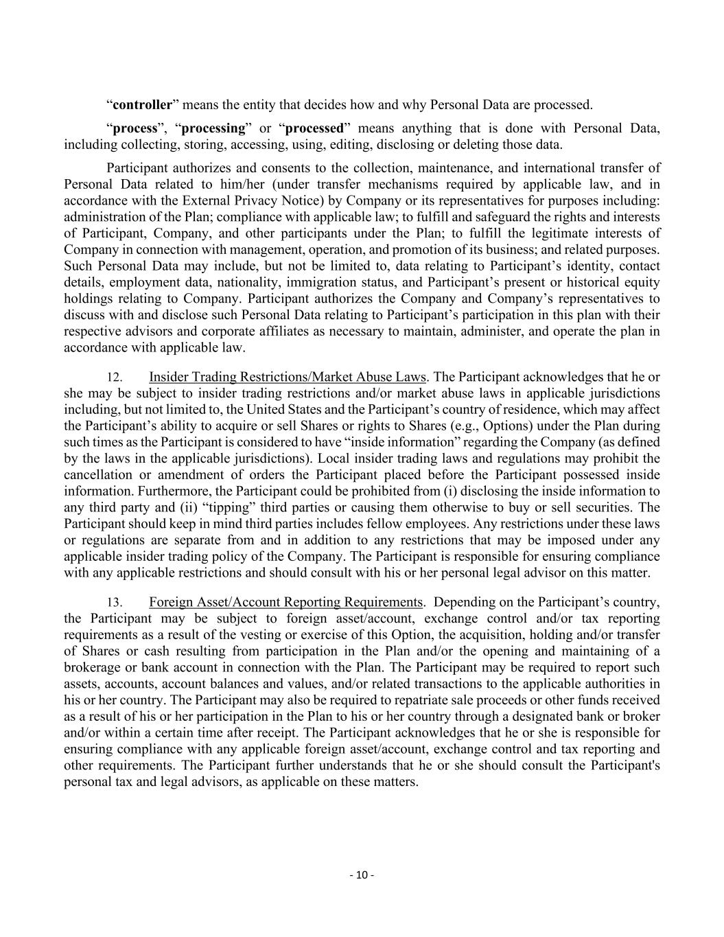 - 10 - “controller” means the entity that decides how and why Personal Data are processed. “process”, “processing” or “processed” means anything that is done with Personal Data, including collecting, storing, accessing, using, editing, disclosing or deleting those data. Participant authorizes and consents to the collection, maintenance, and international transfer of Personal Data related to him/her (under transfer mechanisms required by applicable law, and in accordance with the External Privacy Notice) by Company or its representatives for purposes including: administration of the Plan; compliance with applicable law; to fulfill and safeguard the rights and interests of Participant, Company, and other participants under the Plan; to fulfill the legitimate interests of Company in connection with management, operation, and promotion of its business; and related purposes. Such Personal Data may include, but not be limited to, data relating to Participant’s identity, contact details, employment data, nationality, immigration status, and Participant’s present or historical equity holdings relating to Company. Participant authorizes the Company and Company’s representatives to discuss with and disclose such Personal Data relating to Participant’s participation in this plan with their respective advisors and corporate affiliates as necessary to maintain, administer, and operate the plan in accordance with applicable law. 12. Insider Trading Restrictions/Market Abuse Laws. The Participant acknowledges that he or she may be subject to insider trading restrictions and/or market abuse laws in applicable jurisdictions including, but not limited to, the United States and the Participant’s country of residence, which may affect the Participant’s ability to acquire or sell Shares or rights to Shares (e.g., Options) under the Plan during such times as the Participant is considered to have “inside information” regarding the Company (as defined by the laws in the applicable jurisdictions). Local insider trading laws and regulations may prohibit the cancellation or amendment of orders the Participant placed before the Participant possessed inside information. Furthermore, the Participant could be prohibited from (i) disclosing the inside information to any third party and (ii) “tipping” third parties or causing them otherwise to buy or sell securities. The Participant should keep in mind third parties includes fellow employees. Any restrictions under these laws or regulations are separate from and in addition to any restrictions that may be imposed under any applicable insider trading policy of the Company. The Participant is responsible for ensuring compliance with any applicable restrictions and should consult with his or her personal legal advisor on this matter. 13. Foreign Asset/Account Reporting Requirements. Depending on the Participant’s country, the Participant may be subject to foreign asset/account, exchange control and/or tax reporting requirements as a result of the vesting or exercise of this Option, the acquisition, holding and/or transfer of Shares or cash resulting from participation in the Plan and/or the opening and maintaining of a brokerage or bank account in connection with the Plan. The Participant may be required to report such assets, accounts, account balances and values, and/or related transactions to the applicable authorities in his or her country. The Participant may also be required to repatriate sale proceeds or other funds received as a result of his or her participation in the Plan to his or her country through a designated bank or broker and/or within a certain time after receipt. The Participant acknowledges that he or she is responsible for ensuring compliance with any applicable foreign asset/account, exchange control and tax reporting and other requirements. The Participant further understands that he or she should consult the Participant's personal tax and legal advisors, as applicable on these matters.