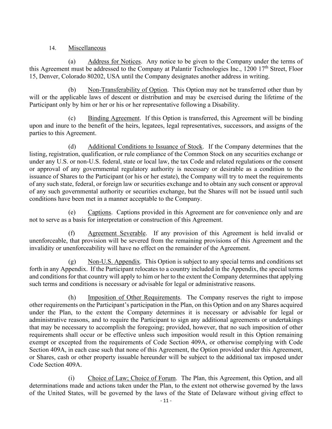 - 11 - 14. Miscellaneous (a) Address for Notices. Any notice to be given to the Company under the terms of this Agreement must be addressed to the Company at Palantir Technologies Inc., 1200 17th Street, Floor 15, Denver, Colorado 80202, USA until the Company designates another address in writing. (b) Non-Transferability of Option. This Option may not be transferred other than by will or the applicable laws of descent or distribution and may be exercised during the lifetime of the Participant only by him or her or his or her representative following a Disability. (c) Binding Agreement. If this Option is transferred, this Agreement will be binding upon and inure to the benefit of the heirs, legatees, legal representatives, successors, and assigns of the parties to this Agreement. (d) Additional Conditions to Issuance of Stock. If the Company determines that the listing, registration, qualification, or rule compliance of the Common Stock on any securities exchange or under any U.S. or non-U.S. federal, state or local law, the tax Code and related regulations or the consent or approval of any governmental regulatory authority is necessary or desirable as a condition to the issuance of Shares to the Participant (or his or her estate), the Company will try to meet the requirements of any such state, federal, or foreign law or securities exchange and to obtain any such consent or approval of any such governmental authority or securities exchange, but the Shares will not be issued until such conditions have been met in a manner acceptable to the Company. (e) Captions. Captions provided in this Agreement are for convenience only and are not to serve as a basis for interpretation or construction of this Agreement. (f) Agreement Severable. If any provision of this Agreement is held invalid or unenforceable, that provision will be severed from the remaining provisions of this Agreement and the invalidity or unenforceability will have no effect on the remainder of the Agreement. (g) Non-U.S. Appendix. This Option is subject to any special terms and conditions set forth in any Appendix. If the Participant relocates to a country included in the Appendix, the special terms and conditions for that country will apply to him or her to the extent the Company determines that applying such terms and conditions is necessary or advisable for legal or administrative reasons. (h) Imposition of Other Requirements. The Company reserves the right to impose other requirements on the Participant’s participation in the Plan, on this Option and on any Shares acquired under the Plan, to the extent the Company determines it is necessary or advisable for legal or administrative reasons, and to require the Participant to sign any additional agreements or undertakings that may be necessary to accomplish the foregoing; provided, however, that no such imposition of other requirements shall occur or be effective unless such imposition would result in this Option remaining exempt or excepted from the requirements of Code Section 409A, or otherwise complying with Code Section 409A, in each case such that none of this Agreement, the Option provided under this Agreement, or Shares, cash or other property issuable hereunder will be subject to the additional tax imposed under Code Section 409A. (i) Choice of Law; Choice of Forum. The Plan, this Agreement, this Option, and all determinations made and actions taken under the Plan, to the extent not otherwise governed by the laws of the United States, will be governed by the laws of the State of Delaware without giving effect to