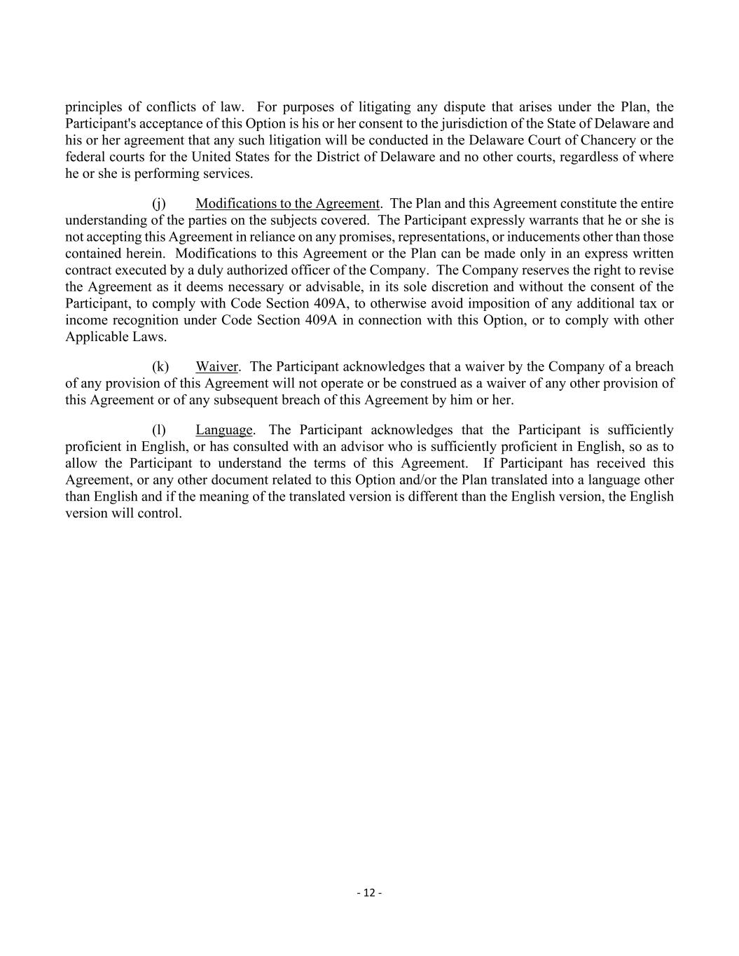- 12 - principles of conflicts of law. For purposes of litigating any dispute that arises under the Plan, the Participant's acceptance of this Option is his or her consent to the jurisdiction of the State of Delaware and his or her agreement that any such litigation will be conducted in the Delaware Court of Chancery or the federal courts for the United States for the District of Delaware and no other courts, regardless of where he or she is performing services. (j) Modifications to the Agreement. The Plan and this Agreement constitute the entire understanding of the parties on the subjects covered. The Participant expressly warrants that he or she is not accepting this Agreement in reliance on any promises, representations, or inducements other than those contained herein. Modifications to this Agreement or the Plan can be made only in an express written contract executed by a duly authorized officer of the Company. The Company reserves the right to revise the Agreement as it deems necessary or advisable, in its sole discretion and without the consent of the Participant, to comply with Code Section 409A, to otherwise avoid imposition of any additional tax or income recognition under Code Section 409A in connection with this Option, or to comply with other Applicable Laws. (k) Waiver. The Participant acknowledges that a waiver by the Company of a breach of any provision of this Agreement will not operate or be construed as a waiver of any other provision of this Agreement or of any subsequent breach of this Agreement by him or her. (l) Language. The Participant acknowledges that the Participant is sufficiently proficient in English, or has consulted with an advisor who is sufficiently proficient in English, so as to allow the Participant to understand the terms of this Agreement. If Participant has received this Agreement, or any other document related to this Option and/or the Plan translated into a language other than English and if the meaning of the translated version is different than the English version, the English version will control.