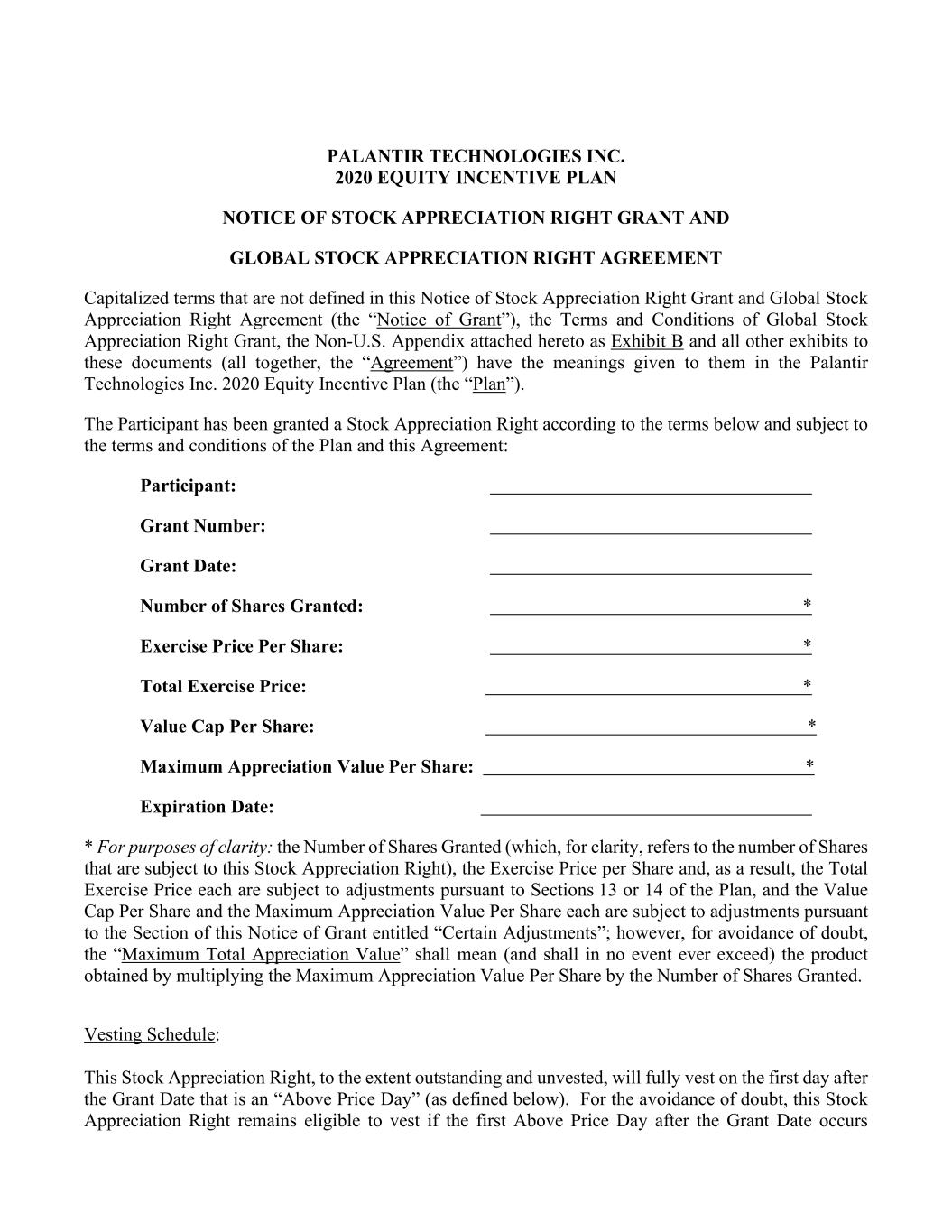 PALANTIR TECHNOLOGIES INC. 2020 EQUITY INCENTIVE PLAN NOTICE OF STOCK APPRECIATION RIGHT GRANT AND GLOBAL STOCK APPRECIATION RIGHT AGREEMENT Capitalized terms that are not defined in this Notice of Stock Appreciation Right Grant and Global Stock Appreciation Right Agreement (the “Notice of Grant”), the Terms and Conditions of Global Stock Appreciation Right Grant, the Non-U.S. Appendix attached hereto as Exhibit B and all other exhibits to these documents (all together, the “Agreement”) have the meanings given to them in the Palantir Technologies Inc. 2020 Equity Incentive Plan (the “Plan”). The Participant has been granted a Stock Appreciation Right according to the terms below and subject to the terms and conditions of the Plan and this Agreement: Participant: Grant Number: Grant Date: Number of Shares Granted: * Exercise Price Per Share: * Total Exercise Price: * Value Cap Per Share: * Maximum Appreciation Value Per Share: * Expiration Date: * For purposes of clarity: the Number of Shares Granted (which, for clarity, refers to the number of Shares that are subject to this Stock Appreciation Right), the Exercise Price per Share and, as a result, the Total Exercise Price each are subject to adjustments pursuant to Sections 13 or 14 of the Plan, and the Value Cap Per Share and the Maximum Appreciation Value Per Share each are subject to adjustments pursuant to the Section of this Notice of Grant entitled “Certain Adjustments”; however, for avoidance of doubt, the “Maximum Total Appreciation Value” shall mean (and shall in no event ever exceed) the product obtained by multiplying the Maximum Appreciation Value Per Share by the Number of Shares Granted. Vesting Schedule: This Stock Appreciation Right, to the extent outstanding and unvested, will fully vest on the first day after the Grant Date that is an “Above Price Day” (as defined below). For the avoidance of doubt, this Stock Appreciation Right remains eligible to vest if the first Above Price Day after the Grant Date occurs