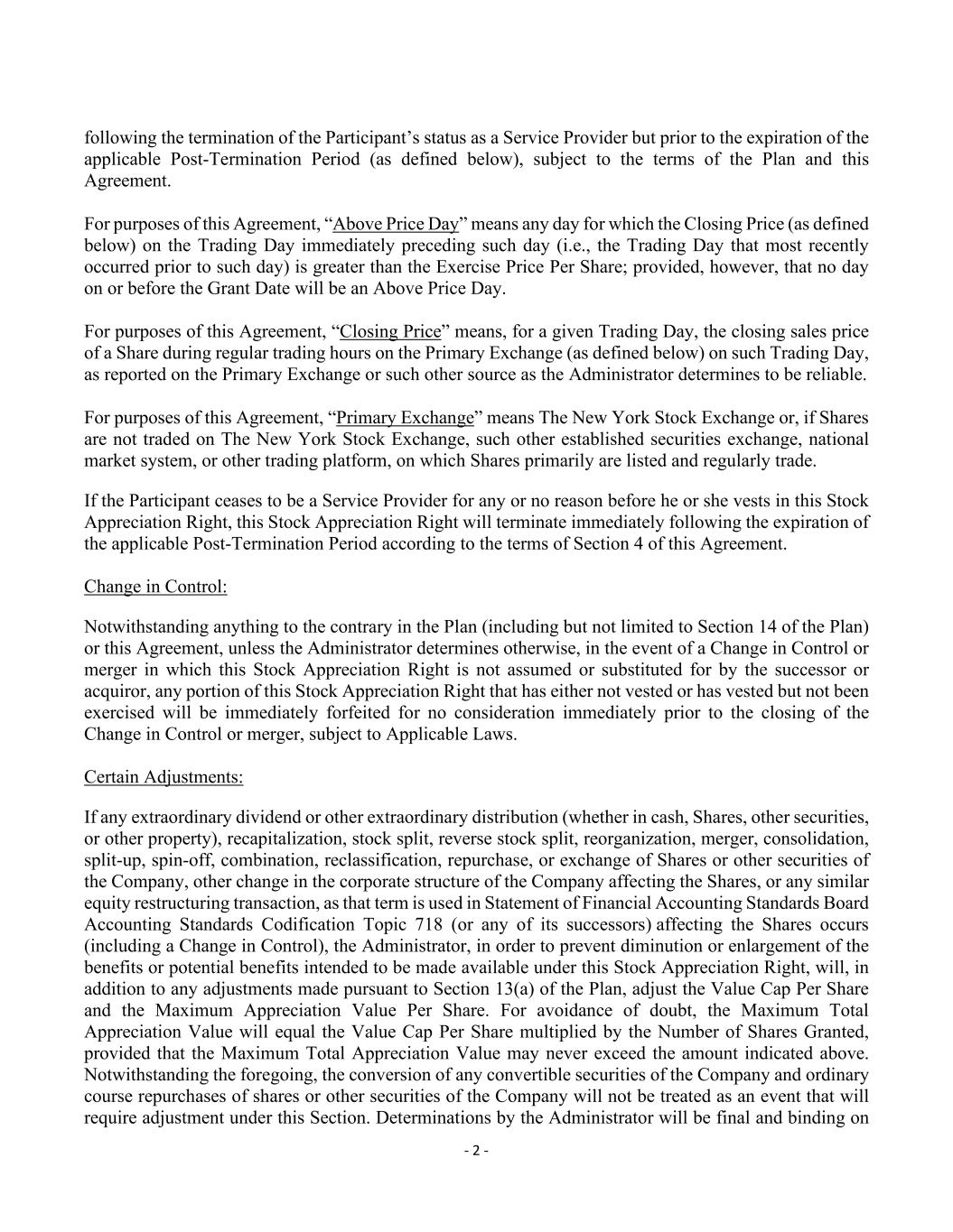 - 2 - following the termination of the Participant’s status as a Service Provider but prior to the expiration of the applicable Post-Termination Period (as defined below), subject to the terms of the Plan and this Agreement. For purposes of this Agreement, “Above Price Day” means any day for which the Closing Price (as defined below) on the Trading Day immediately preceding such day (i.e., the Trading Day that most recently occurred prior to such day) is greater than the Exercise Price Per Share; provided, however, that no day on or before the Grant Date will be an Above Price Day. For purposes of this Agreement, “Closing Price” means, for a given Trading Day, the closing sales price of a Share during regular trading hours on the Primary Exchange (as defined below) on such Trading Day, as reported on the Primary Exchange or such other source as the Administrator determines to be reliable. For purposes of this Agreement, “Primary Exchange” means The New York Stock Exchange or, if Shares are not traded on The New York Stock Exchange, such other established securities exchange, national market system, or other trading platform, on which Shares primarily are listed and regularly trade. If the Participant ceases to be a Service Provider for any or no reason before he or she vests in this Stock Appreciation Right, this Stock Appreciation Right will terminate immediately following the expiration of the applicable Post-Termination Period according to the terms of Section 4 of this Agreement. Change in Control: Notwithstanding anything to the contrary in the Plan (including but not limited to Section 14 of the Plan) or this Agreement, unless the Administrator determines otherwise, in the event of a Change in Control or merger in which this Stock Appreciation Right is not assumed or substituted for by the successor or acquiror, any portion of this Stock Appreciation Right that has either not vested or has vested but not been exercised will be immediately forfeited for no consideration immediately prior to the closing of the Change in Control or merger, subject to Applicable Laws. Certain Adjustments: If any extraordinary dividend or other extraordinary distribution (whether in cash, Shares, other securities, or other property), recapitalization, stock split, reverse stock split, reorganization, merger, consolidation, split-up, spin-off, combination, reclassification, repurchase, or exchange of Shares or other securities of the Company, other change in the corporate structure of the Company affecting the Shares, or any similar equity restructuring transaction, as that term is used in Statement of Financial Accounting Standards Board Accounting Standards Codification Topic 718 (or any of its successors) affecting the Shares occurs (including a Change in Control), the Administrator, in order to prevent diminution or enlargement of the benefits or potential benefits intended to be made available under this Stock Appreciation Right, will, in addition to any adjustments made pursuant to Section 13(a) of the Plan, adjust the Value Cap Per Share and the Maximum Appreciation Value Per Share. For avoidance of doubt, the Maximum Total Appreciation Value will equal the Value Cap Per Share multiplied by the Number of Shares Granted, provided that the Maximum Total Appreciation Value may never exceed the amount indicated above. Notwithstanding the foregoing, the conversion of any convertible securities of the Company and ordinary course repurchases of shares or other securities of the Company will not be treated as an event that will require adjustment under this Section. Determinations by the Administrator will be final and binding on
