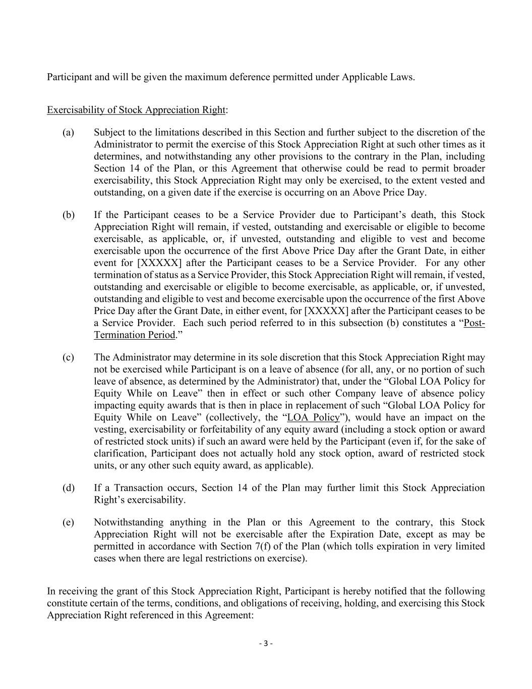 - 3 - Participant and will be given the maximum deference permitted under Applicable Laws. Exercisability of Stock Appreciation Right: (a) Subject to the limitations described in this Section and further subject to the discretion of the Administrator to permit the exercise of this Stock Appreciation Right at such other times as it determines, and notwithstanding any other provisions to the contrary in the Plan, including Section 14 of the Plan, or this Agreement that otherwise could be read to permit broader exercisability, this Stock Appreciation Right may only be exercised, to the extent vested and outstanding, on a given date if the exercise is occurring on an Above Price Day. (b) If the Participant ceases to be a Service Provider due to Participant’s death, this Stock Appreciation Right will remain, if vested, outstanding and exercisable or eligible to become exercisable, as applicable, or, if unvested, outstanding and eligible to vest and become exercisable upon the occurrence of the first Above Price Day after the Grant Date, in either event for [XXXXX] after the Participant ceases to be a Service Provider. For any other termination of status as a Service Provider, this Stock Appreciation Right will remain, if vested, outstanding and exercisable or eligible to become exercisable, as applicable, or, if unvested, outstanding and eligible to vest and become exercisable upon the occurrence of the first Above Price Day after the Grant Date, in either event, for [XXXXX] after the Participant ceases to be a Service Provider. Each such period referred to in this subsection (b) constitutes a “Post- Termination Period.” (c) The Administrator may determine in its sole discretion that this Stock Appreciation Right may not be exercised while Participant is on a leave of absence (for all, any, or no portion of such leave of absence, as determined by the Administrator) that, under the “Global LOA Policy for Equity While on Leave” then in effect or such other Company leave of absence policy impacting equity awards that is then in place in replacement of such “Global LOA Policy for Equity While on Leave” (collectively, the “LOA Policy”), would have an impact on the vesting, exercisability or forfeitability of any equity award (including a stock option or award of restricted stock units) if such an award were held by the Participant (even if, for the sake of clarification, Participant does not actually hold any stock option, award of restricted stock units, or any other such equity award, as applicable). (d) If a Transaction occurs, Section 14 of the Plan may further limit this Stock Appreciation Right’s exercisability. (e) Notwithstanding anything in the Plan or this Agreement to the contrary, this Stock Appreciation Right will not be exercisable after the Expiration Date, except as may be permitted in accordance with Section 7(f) of the Plan (which tolls expiration in very limited cases when there are legal restrictions on exercise). In receiving the grant of this Stock Appreciation Right, Participant is hereby notified that the following constitute certain of the terms, conditions, and obligations of receiving, holding, and exercising this Stock Appreciation Right referenced in this Agreement: