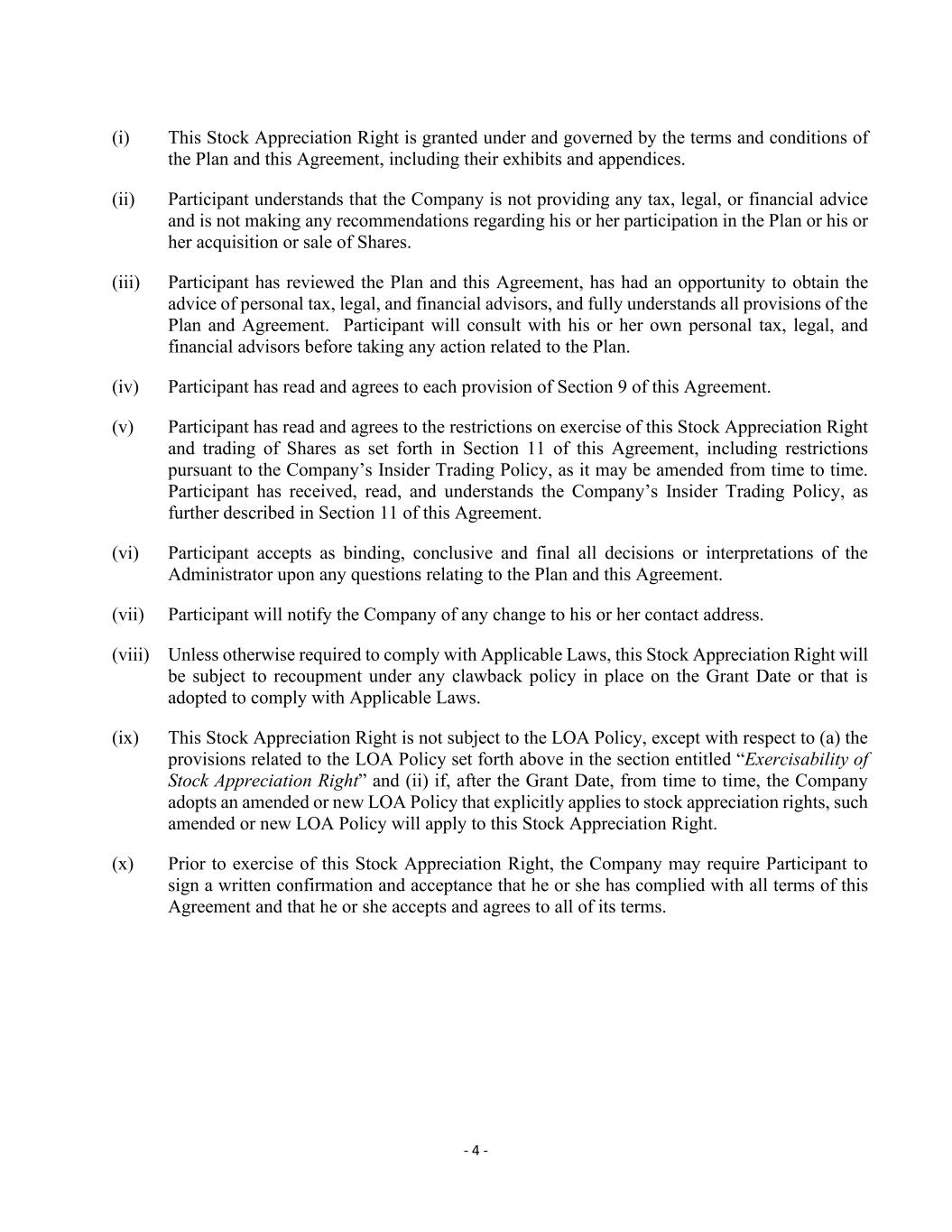 - 4 - (i) This Stock Appreciation Right is granted under and governed by the terms and conditions of the Plan and this Agreement, including their exhibits and appendices. (ii) Participant understands that the Company is not providing any tax, legal, or financial advice and is not making any recommendations regarding his or her participation in the Plan or his or her acquisition or sale of Shares. (iii) Participant has reviewed the Plan and this Agreement, has had an opportunity to obtain the advice of personal tax, legal, and financial advisors, and fully understands all provisions of the Plan and Agreement. Participant will consult with his or her own personal tax, legal, and financial advisors before taking any action related to the Plan. (iv) Participant has read and agrees to each provision of Section 9 of this Agreement. (v) Participant has read and agrees to the restrictions on exercise of this Stock Appreciation Right and trading of Shares as set forth in Section 11 of this Agreement, including restrictions pursuant to the Company’s Insider Trading Policy, as it may be amended from time to time. Participant has received, read, and understands the Company’s Insider Trading Policy, as further described in Section 11 of this Agreement. (vi) Participant accepts as binding, conclusive and final all decisions or interpretations of the Administrator upon any questions relating to the Plan and this Agreement. (vii) Participant will notify the Company of any change to his or her contact address. (viii) Unless otherwise required to comply with Applicable Laws, this Stock Appreciation Right will be subject to recoupment under any clawback policy in place on the Grant Date or that is adopted to comply with Applicable Laws. (ix) This Stock Appreciation Right is not subject to the LOA Policy, except with respect to (a) the provisions related to the LOA Policy set forth above in the section entitled “Exercisability of Stock Appreciation Right” and (ii) if, after the Grant Date, from time to time, the Company adopts an amended or new LOA Policy that explicitly applies to stock appreciation rights, such amended or new LOA Policy will apply to this Stock Appreciation Right. (x) Prior to exercise of this Stock Appreciation Right, the Company may require Participant to sign a written confirmation and acceptance that he or she has complied with all terms of this Agreement and that he or she accepts and agrees to all of its terms.