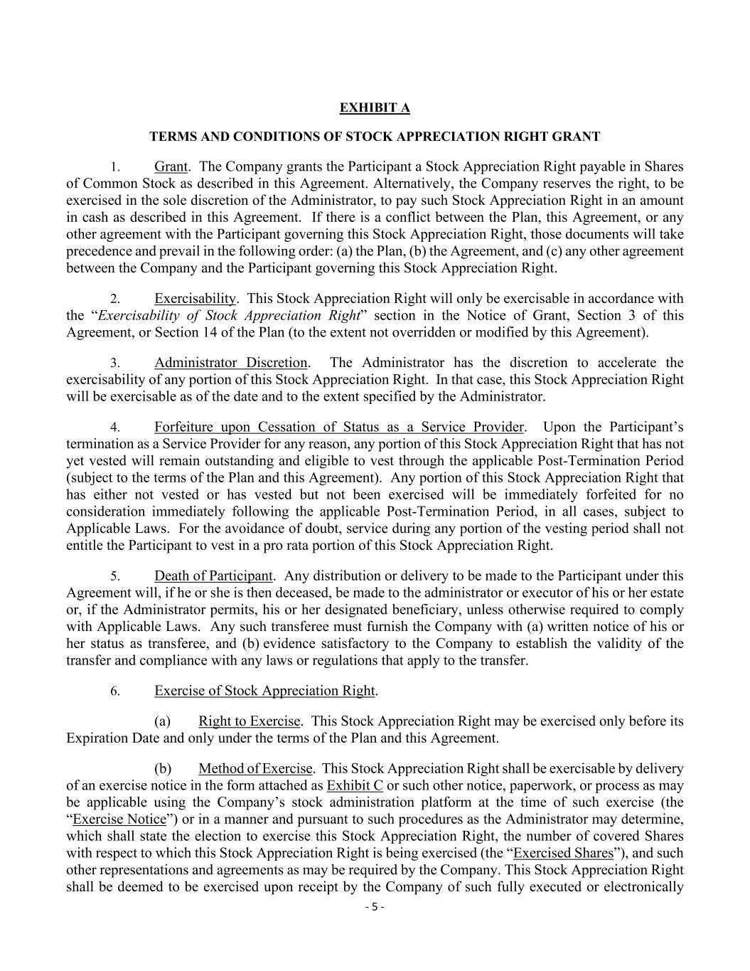 - 5 - EXHIBIT A TERMS AND CONDITIONS OF STOCK APPRECIATION RIGHT GRANT 1. Grant. The Company grants the Participant a Stock Appreciation Right payable in Shares of Common Stock as described in this Agreement. Alternatively, the Company reserves the right, to be exercised in the sole discretion of the Administrator, to pay such Stock Appreciation Right in an amount in cash as described in this Agreement. If there is a conflict between the Plan, this Agreement, or any other agreement with the Participant governing this Stock Appreciation Right, those documents will take precedence and prevail in the following order: (a) the Plan, (b) the Agreement, and (c) any other agreement between the Company and the Participant governing this Stock Appreciation Right. 2. Exercisability. This Stock Appreciation Right will only be exercisable in accordance with the “Exercisability of Stock Appreciation Right” section in the Notice of Grant, Section 3 of this Agreement, or Section 14 of the Plan (to the extent not overridden or modified by this Agreement). 3. Administrator Discretion. The Administrator has the discretion to accelerate the exercisability of any portion of this Stock Appreciation Right. In that case, this Stock Appreciation Right will be exercisable as of the date and to the extent specified by the Administrator. 4. Forfeiture upon Cessation of Status as a Service Provider. Upon the Participant’s termination as a Service Provider for any reason, any portion of this Stock Appreciation Right that has not yet vested will remain outstanding and eligible to vest through the applicable Post-Termination Period (subject to the terms of the Plan and this Agreement). Any portion of this Stock Appreciation Right that has either not vested or has vested but not been exercised will be immediately forfeited for no consideration immediately following the applicable Post-Termination Period, in all cases, subject to Applicable Laws. For the avoidance of doubt, service during any portion of the vesting period shall not entitle the Participant to vest in a pro rata portion of this Stock Appreciation Right. 5. Death of Participant. Any distribution or delivery to be made to the Participant under this Agreement will, if he or she is then deceased, be made to the administrator or executor of his or her estate or, if the Administrator permits, his or her designated beneficiary, unless otherwise required to comply with Applicable Laws. Any such transferee must furnish the Company with (a) written notice of his or her status as transferee, and (b) evidence satisfactory to the Company to establish the validity of the transfer and compliance with any laws or regulations that apply to the transfer. 6. Exercise of Stock Appreciation Right. (a) Right to Exercise. This Stock Appreciation Right may be exercised only before its Expiration Date and only under the terms of the Plan and this Agreement. (b) Method of Exercise. This Stock Appreciation Right shall be exercisable by delivery of an exercise notice in the form attached as Exhibit C or such other notice, paperwork, or process as may be applicable using the Company’s stock administration platform at the time of such exercise (the “Exercise Notice”) or in a manner and pursuant to such procedures as the Administrator may determine, which shall state the election to exercise this Stock Appreciation Right, the number of covered Shares with respect to which this Stock Appreciation Right is being exercised (the “Exercised Shares”), and such other representations and agreements as may be required by the Company. This Stock Appreciation Right shall be deemed to be exercised upon receipt by the Company of such fully executed or electronically
