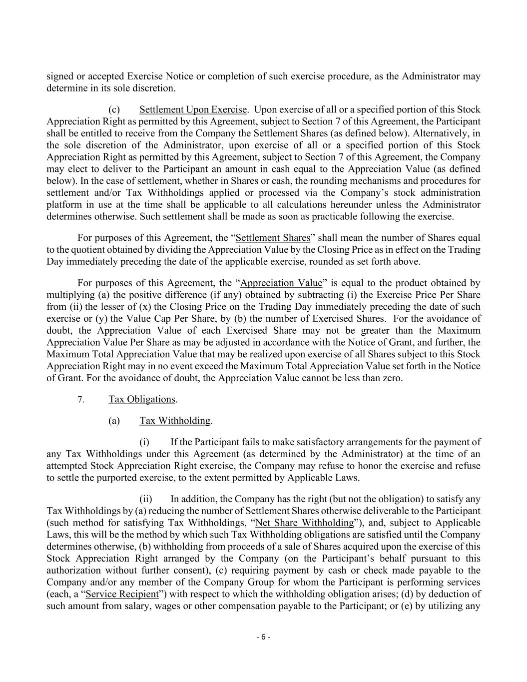 - 6 - signed or accepted Exercise Notice or completion of such exercise procedure, as the Administrator may determine in its sole discretion. (c) Settlement Upon Exercise. Upon exercise of all or a specified portion of this Stock Appreciation Right as permitted by this Agreement, subject to Section 7 of this Agreement, the Participant shall be entitled to receive from the Company the Settlement Shares (as defined below). Alternatively, in the sole discretion of the Administrator, upon exercise of all or a specified portion of this Stock Appreciation Right as permitted by this Agreement, subject to Section 7 of this Agreement, the Company may elect to deliver to the Participant an amount in cash equal to the Appreciation Value (as defined below). In the case of settlement, whether in Shares or cash, the rounding mechanisms and procedures for settlement and/or Tax Withholdings applied or processed via the Company’s stock administration platform in use at the time shall be applicable to all calculations hereunder unless the Administrator determines otherwise. Such settlement shall be made as soon as practicable following the exercise. For purposes of this Agreement, the “Settlement Shares” shall mean the number of Shares equal to the quotient obtained by dividing the Appreciation Value by the Closing Price as in effect on the Trading Day immediately preceding the date of the applicable exercise, rounded as set forth above. For purposes of this Agreement, the “Appreciation Value” is equal to the product obtained by multiplying (a) the positive difference (if any) obtained by subtracting (i) the Exercise Price Per Share from (ii) the lesser of (x) the Closing Price on the Trading Day immediately preceding the date of such exercise or (y) the Value Cap Per Share, by (b) the number of Exercised Shares. For the avoidance of doubt, the Appreciation Value of each Exercised Share may not be greater than the Maximum Appreciation Value Per Share as may be adjusted in accordance with the Notice of Grant, and further, the Maximum Total Appreciation Value that may be realized upon exercise of all Shares subject to this Stock Appreciation Right may in no event exceed the Maximum Total Appreciation Value set forth in the Notice of Grant. For the avoidance of doubt, the Appreciation Value cannot be less than zero. 7. Tax Obligations. (a) Tax Withholding. (i) If the Participant fails to make satisfactory arrangements for the payment of any Tax Withholdings under this Agreement (as determined by the Administrator) at the time of an attempted Stock Appreciation Right exercise, the Company may refuse to honor the exercise and refuse to settle the purported exercise, to the extent permitted by Applicable Laws. (ii) In addition, the Company has the right (but not the obligation) to satisfy any Tax Withholdings by (a) reducing the number of Settlement Shares otherwise deliverable to the Participant (such method for satisfying Tax Withholdings, “Net Share Withholding”), and, subject to Applicable Laws, this will be the method by which such Tax Withholding obligations are satisfied until the Company determines otherwise, (b) withholding from proceeds of a sale of Shares acquired upon the exercise of this Stock Appreciation Right arranged by the Company (on the Participant’s behalf pursuant to this authorization without further consent), (c) requiring payment by cash or check made payable to the Company and/or any member of the Company Group for whom the Participant is performing services (each, a “Service Recipient”) with respect to which the withholding obligation arises; (d) by deduction of such amount from salary, wages or other compensation payable to the Participant; or (e) by utilizing any