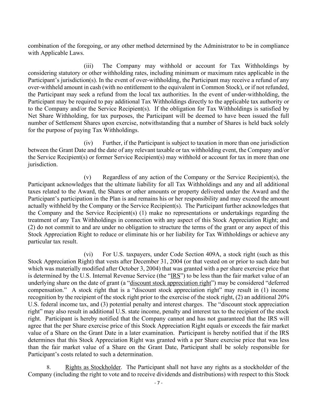 - 7 - combination of the foregoing, or any other method determined by the Administrator to be in compliance with Applicable Laws. (iii) The Company may withhold or account for Tax Withholdings by considering statutory or other withholding rates, including minimum or maximum rates applicable in the Participant’s jurisdiction(s). In the event of over-withholding, the Participant may receive a refund of any over-withheld amount in cash (with no entitlement to the equivalent in Common Stock), or if not refunded, the Participant may seek a refund from the local tax authorities. In the event of under-withholding, the Participant may be required to pay additional Tax Withholdings directly to the applicable tax authority or to the Company and/or the Service Recipient(s). If the obligation for Tax Withholdings is satisfied by Net Share Withholding, for tax purposes, the Participant will be deemed to have been issued the full number of Settlement Shares upon exercise, notwithstanding that a number of Shares is held back solely for the purpose of paying Tax Withholdings. (iv) Further, if the Participant is subject to taxation in more than one jurisdiction between the Grant Date and the date of any relevant taxable or tax withholding event, the Company and/or the Service Recipient(s) or former Service Recipient(s) may withhold or account for tax in more than one jurisdiction. (v) Regardless of any action of the Company or the Service Recipient(s), the Participant acknowledges that the ultimate liability for all Tax Withholdings and any and all additional taxes related to the Award, the Shares or other amounts or property delivered under the Award and the Participant’s participation in the Plan is and remains his or her responsibility and may exceed the amount actually withheld by the Company or the Service Recipient(s). The Participant further acknowledges that the Company and the Service Recipient(s) (1) make no representations or undertakings regarding the treatment of any Tax Withholdings in connection with any aspect of this Stock Appreciation Right; and (2) do not commit to and are under no obligation to structure the terms of the grant or any aspect of this Stock Appreciation Right to reduce or eliminate his or her liability for Tax Withholdings or achieve any particular tax result. (vi) For U.S. taxpayers, under Code Section 409A, a stock right (such as this Stock Appreciation Right) that vests after December 31, 2004 (or that vested on or prior to such date but which was materially modified after October 3, 2004) that was granted with a per share exercise price that is determined by the U.S. Internal Revenue Service (the “IRS”) to be less than the fair market value of an underlying share on the date of grant (a “discount stock appreciation right”) may be considered “deferred compensation.” A stock right that is a “discount stock appreciation right” may result in (1) income recognition by the recipient of the stock right prior to the exercise of the stock right, (2) an additional 20% U.S. federal income tax, and (3) potential penalty and interest charges. The “discount stock appreciation right” may also result in additional U.S. state income, penalty and interest tax to the recipient of the stock right. Participant is hereby notified that the Company cannot and has not guaranteed that the IRS will agree that the per Share exercise price of this Stock Appreciation Right equals or exceeds the fair market value of a Share on the Grant Date in a later examination. Participant is hereby notified that if the IRS determines that this Stock Appreciation Right was granted with a per Share exercise price that was less than the fair market value of a Share on the Grant Date, Participant shall be solely responsible for Participant’s costs related to such a determination. 8. Rights as Stockholder. The Participant shall not have any rights as a stockholder of the Company (including the right to vote and to receive dividends and distributions) with respect to this Stock