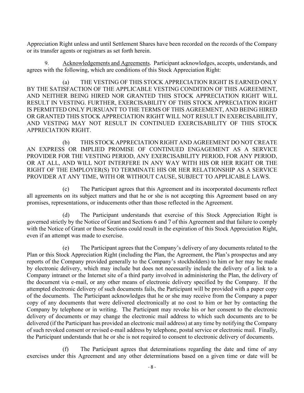 - 8 - Appreciation Right unless and until Settlement Shares have been recorded on the records of the Company or its transfer agents or registrars as set forth herein. 9. Acknowledgements and Agreements. Participant acknowledges, accepts, understands, and agrees with the following, which are conditions of this Stock Appreciation Right: (a) THE VESTING OF THIS STOCK APPRECIATION RIGHT IS EARNED ONLY BY THE SATISFACTION OF THE APPLICABLE VESTING CONDITION OF THIS AGREEMENT, AND NEITHER BEING HIRED NOR GRANTED THIS STOCK APPRECIATION RIGHT WILL RESULT IN VESTING. FURTHER, EXERCISABILITY OF THIS STOCK APPRECIATION RIGHT IS PERMITTED ONLY PURSUANT TO THE TERMS OF THIS AGREEMENT, AND BEING HIRED OR GRANTED THIS STOCK APPRECIATION RIGHT WILL NOT RESULT IN EXERCISABILITY, AND VESTING MAY NOT RESULT IN CONTINUED EXERCISABILITY OF THIS STOCK APPRECIATION RIGHT. (b) THIS STOCK APPRECIATION RIGHT AND AGREEMENT DO NOT CREATE AN EXPRESS OR IMPLIED PROMISE OF CONTINUED ENGAGEMENT AS A SERVICE PROVIDER FOR THE VESTING PERIOD, ANY EXERCISABILITY PERIOD, FOR ANY PERIOD, OR AT ALL, AND WILL NOT INTERFERE IN ANY WAY WITH HIS OR HER RIGHT OR THE RIGHT OF THE EMPLOYER(S) TO TERMINATE HIS OR HER RELATIONSHIP AS A SERVICE PROVIDER AT ANY TIME, WITH OR WITHOUT CAUSE, SUBJECT TO APPLICABLE LAWS. (c) The Participant agrees that this Agreement and its incorporated documents reflect all agreements on its subject matters and that he or she is not accepting this Agreement based on any promises, representations, or inducements other than those reflected in the Agreement. (d) The Participant understands that exercise of this Stock Appreciation Right is governed strictly by the Notice of Grant and Sections 6 and 7 of this Agreement and that failure to comply with the Notice of Grant or those Sections could result in the expiration of this Stock Appreciation Right, even if an attempt was made to exercise. (e) The Participant agrees that the Company’s delivery of any documents related to the Plan or this Stock Appreciation Right (including the Plan, the Agreement, the Plan’s prospectus and any reports of the Company provided generally to the Company’s stockholders) to him or her may be made by electronic delivery, which may include but does not necessarily include the delivery of a link to a Company intranet or the Internet site of a third party involved in administering the Plan, the delivery of the document via e-mail, or any other means of electronic delivery specified by the Company. If the attempted electronic delivery of such documents fails, the Participant will be provided with a paper copy of the documents. The Participant acknowledges that he or she may receive from the Company a paper copy of any documents that were delivered electronically at no cost to him or her by contacting the Company by telephone or in writing. The Participant may revoke his or her consent to the electronic delivery of documents or may change the electronic mail address to which such documents are to be delivered (if the Participant has provided an electronic mail address) at any time by notifying the Company of such revoked consent or revised e-mail address by telephone, postal service or electronic mail. Finally, the Participant understands that he or she is not required to consent to electronic delivery of documents. (f) The Participant agrees that determinations regarding the date and time of any exercises under this Agreement and any other determinations based on a given time or date will be