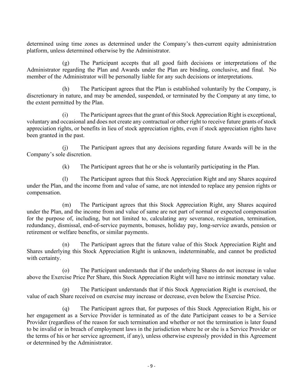 - 9 - determined using time zones as determined under the Company’s then-current equity administration platform, unless determined otherwise by the Administrator. (g) The Participant accepts that all good faith decisions or interpretations of the Administrator regarding the Plan and Awards under the Plan are binding, conclusive, and final. No member of the Administrator will be personally liable for any such decisions or interpretations. (h) The Participant agrees that the Plan is established voluntarily by the Company, is discretionary in nature, and may be amended, suspended, or terminated by the Company at any time, to the extent permitted by the Plan. (i) The Participant agrees that the grant of this Stock Appreciation Right is exceptional, voluntary and occasional and does not create any contractual or other right to receive future grants of stock appreciation rights, or benefits in lieu of stock appreciation rights, even if stock appreciation rights have been granted in the past. (j) The Participant agrees that any decisions regarding future Awards will be in the Company’s sole discretion. (k) The Participant agrees that he or she is voluntarily participating in the Plan. (l) The Participant agrees that this Stock Appreciation Right and any Shares acquired under the Plan, and the income from and value of same, are not intended to replace any pension rights or compensation. (m) The Participant agrees that this Stock Appreciation Right, any Shares acquired under the Plan, and the income from and value of same are not part of normal or expected compensation for the purpose of, including, but not limited to, calculating any severance, resignation, termination, redundancy, dismissal, end-of-service payments, bonuses, holiday pay, long-service awards, pension or retirement or welfare benefits, or similar payments. (n) The Participant agrees that the future value of this Stock Appreciation Right and Shares underlying this Stock Appreciation Right is unknown, indeterminable, and cannot be predicted with certainty. (o) The Participant understands that if the underlying Shares do not increase in value above the Exercise Price Per Share, this Stock Appreciation Right will have no intrinsic monetary value. (p) The Participant understands that if this Stock Appreciation Right is exercised, the value of each Share received on exercise may increase or decrease, even below the Exercise Price. (q) The Participant agrees that, for purposes of this Stock Appreciation Right, his or her engagement as a Service Provider is terminated as of the date Participant ceases to be a Service Provider (regardless of the reason for such termination and whether or not the termination is later found to be invalid or in breach of employment laws in the jurisdiction where he or she is a Service Provider or the terms of his or her service agreement, if any), unless otherwise expressly provided in this Agreement or determined by the Administrator.