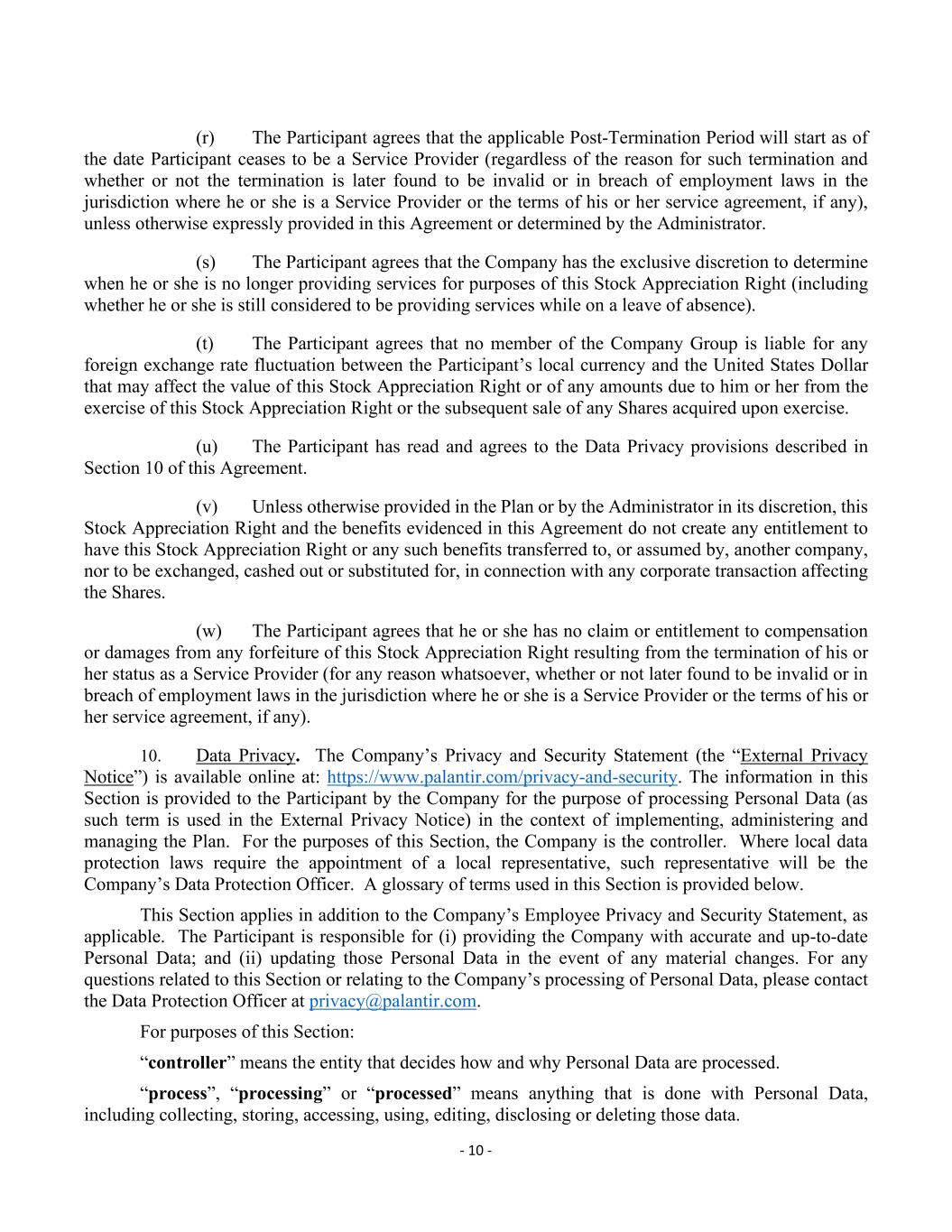 - 10 - (r) The Participant agrees that the applicable Post-Termination Period will start as of the date Participant ceases to be a Service Provider (regardless of the reason for such termination and whether or not the termination is later found to be invalid or in breach of employment laws in the jurisdiction where he or she is a Service Provider or the terms of his or her service agreement, if any), unless otherwise expressly provided in this Agreement or determined by the Administrator. (s) The Participant agrees that the Company has the exclusive discretion to determine when he or she is no longer providing services for purposes of this Stock Appreciation Right (including whether he or she is still considered to be providing services while on a leave of absence). (t) The Participant agrees that no member of the Company Group is liable for any foreign exchange rate fluctuation between the Participant’s local currency and the United States Dollar that may affect the value of this Stock Appreciation Right or of any amounts due to him or her from the exercise of this Stock Appreciation Right or the subsequent sale of any Shares acquired upon exercise. (u) The Participant has read and agrees to the Data Privacy provisions described in Section 10 of this Agreement. (v) Unless otherwise provided in the Plan or by the Administrator in its discretion, this Stock Appreciation Right and the benefits evidenced in this Agreement do not create any entitlement to have this Stock Appreciation Right or any such benefits transferred to, or assumed by, another company, nor to be exchanged, cashed out or substituted for, in connection with any corporate transaction affecting the Shares. (w) The Participant agrees that he or she has no claim or entitlement to compensation or damages from any forfeiture of this Stock Appreciation Right resulting from the termination of his or her status as a Service Provider (for any reason whatsoever, whether or not later found to be invalid or in breach of employment laws in the jurisdiction where he or she is a Service Provider or the terms of his or her service agreement, if any). 10. Data Privacy. The Company’s Privacy and Security Statement (the “External Privacy Notice”) is available online at: https://www.palantir.com/privacy-and-security. The information in this Section is provided to the Participant by the Company for the purpose of processing Personal Data (as such term is used in the External Privacy Notice) in the context of implementing, administering and managing the Plan. For the purposes of this Section, the Company is the controller. Where local data protection laws require the appointment of a local representative, such representative will be the Company’s Data Protection Officer. A glossary of terms used in this Section is provided below. This Section applies in addition to the Company’s Employee Privacy and Security Statement, as applicable. The Participant is responsible for (i) providing the Company with accurate and up-to-date Personal Data; and (ii) updating those Personal Data in the event of any material changes. For any questions related to this Section or relating to the Company’s processing of Personal Data, please contact the Data Protection Officer at [email protected]. For purposes of this Section: “controller” means the entity that decides how and why Personal Data are processed. “process”, “processing” or “processed” means anything that is done with Personal Data, including collecting, storing, accessing, using, editing, disclosing or deleting those data.