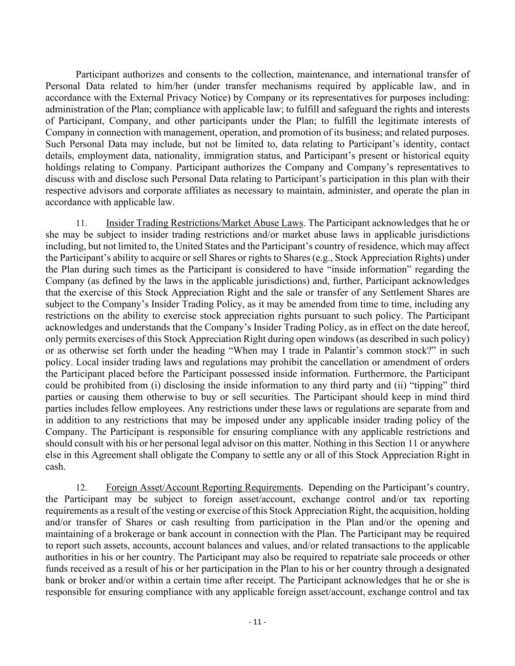- 11 - Participant authorizes and consents to the collection, maintenance, and international transfer of Personal Data related to him/her (under transfer mechanisms required by applicable law, and in accordance with the External Privacy Notice) by Company or its representatives for purposes including: administration of the Plan; compliance with applicable law; to fulfill and safeguard the rights and interests of Participant, Company, and other participants under the Plan; to fulfill the legitimate interests of Company in connection with management, operation, and promotion of its business; and related purposes. Such Personal Data may include, but not be limited to, data relating to Participant’s identity, contact details, employment data, nationality, immigration status, and Participant’s present or historical equity holdings relating to Company. Participant authorizes the Company and Company’s representatives to discuss with and disclose such Personal Data relating to Participant’s participation in this plan with their respective advisors and corporate affiliates as necessary to maintain, administer, and operate the plan in accordance with applicable law. 11. Insider Trading Restrictions/Market Abuse Laws. The Participant acknowledges that he or she may be subject to insider trading restrictions and/or market abuse laws in applicable jurisdictions including, but not limited to, the United States and the Participant’s country of residence, which may affect the Participant’s ability to acquire or sell Shares or rights to Shares (e.g., Stock Appreciation Rights) under the Plan during such times as the Participant is considered to have “inside information” regarding the Company (as defined by the laws in the applicable jurisdictions) and, further, Participant acknowledges that the exercise of this Stock Appreciation Right and the sale or transfer of any Settlement Shares are subject to the Company’s Insider Trading Policy, as it may be amended from time to time, including any restrictions on the ability to exercise stock appreciation rights pursuant to such policy. The Participant acknowledges and understands that the Company’s Insider Trading Policy, as in effect on the date hereof, only permits exercises of this Stock Appreciation Right during open windows (as described in such policy) or as otherwise set forth under the heading “When may I trade in Palantir’s common stock?” in such policy. Local insider trading laws and regulations may prohibit the cancellation or amendment of orders the Participant placed before the Participant possessed inside information. Furthermore, the Participant could be prohibited from (i) disclosing the inside information to any third party and (ii) “tipping” third parties or causing them otherwise to buy or sell securities. The Participant should keep in mind third parties includes fellow employees. Any restrictions under these laws or regulations are separate from and in addition to any restrictions that may be imposed under any applicable insider trading policy of the Company. The Participant is responsible for ensuring compliance with any applicable restrictions and should consult with his or her personal legal advisor on this matter. Nothing in this Section 11 or anywhere else in this Agreement shall obligate the Company to settle any or all of this Stock Appreciation Right in cash. 12. Foreign Asset/Account Reporting Requirements. Depending on the Participant’s country, the Participant may be subject to foreign asset/account, exchange control and/or tax reporting requirements as a result of the vesting or exercise of this Stock Appreciation Right, the acquisition, holding and/or transfer of Shares or cash resulting from participation in the Plan and/or the opening and maintaining of a brokerage or bank account in connection with the Plan. The Participant may be required to report such assets, accounts, account balances and values, and/or related transactions to the applicable authorities in his or her country. The Participant may also be required to repatriate sale proceeds or other funds received as a result of his or her participation in the Plan to his or her country through a designated bank or broker and/or within a certain time after receipt. The Participant acknowledges that he or she is responsible for ensuring compliance with any applicable foreign asset/account, exchange control and tax