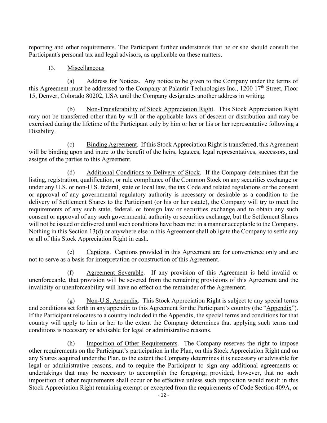 - 12 - reporting and other requirements. The Participant further understands that he or she should consult the Participant's personal tax and legal advisors, as applicable on these matters. 13. Miscellaneous (a) Address for Notices. Any notice to be given to the Company under the terms of this Agreement must be addressed to the Company at Palantir Technologies Inc., 1200 17th Street, Floor 15, Denver, Colorado 80202, USA until the Company designates another address in writing. (b) Non-Transferability of Stock Appreciation Right. This Stock Appreciation Right may not be transferred other than by will or the applicable laws of descent or distribution and may be exercised during the lifetime of the Participant only by him or her or his or her representative following a Disability. (c) Binding Agreement. If this Stock Appreciation Right is transferred, this Agreement will be binding upon and inure to the benefit of the heirs, legatees, legal representatives, successors, and assigns of the parties to this Agreement. (d) Additional Conditions to Delivery of Stock. If the Company determines that the listing, registration, qualification, or rule compliance of the Common Stock on any securities exchange or under any U.S. or non-U.S. federal, state or local law, the tax Code and related regulations or the consent or approval of any governmental regulatory authority is necessary or desirable as a condition to the delivery of Settlement Shares to the Participant (or his or her estate), the Company will try to meet the requirements of any such state, federal, or foreign law or securities exchange and to obtain any such consent or approval of any such governmental authority or securities exchange, but the Settlement Shares will not be issued or delivered until such conditions have been met in a manner acceptable to the Company. Nothing in this Section 13(d) or anywhere else in this Agreement shall obligate the Company to settle any or all of this Stock Appreciation Right in cash. (e) Captions. Captions provided in this Agreement are for convenience only and are not to serve as a basis for interpretation or construction of this Agreement. (f) Agreement Severable. If any provision of this Agreement is held invalid or unenforceable, that provision will be severed from the remaining provisions of this Agreement and the invalidity or unenforceability will have no effect on the remainder of the Agreement. (g) Non-U.S. Appendix. This Stock Appreciation Right is subject to any special terms and conditions set forth in any appendix to this Agreement for the Participant’s country (the “Appendix”). If the Participant relocates to a country included in the Appendix, the special terms and conditions for that country will apply to him or her to the extent the Company determines that applying such terms and conditions is necessary or advisable for legal or administrative reasons. (h) Imposition of Other Requirements. The Company reserves the right to impose other requirements on the Participant’s participation in the Plan, on this Stock Appreciation Right and on any Shares acquired under the Plan, to the extent the Company determines it is necessary or advisable for legal or administrative reasons, and to require the Participant to sign any additional agreements or undertakings that may be necessary to accomplish the foregoing; provided, however, that no such imposition of other requirements shall occur or be effective unless such imposition would result in this Stock Appreciation Right remaining exempt or excepted from the requirements of Code Section 409A, or