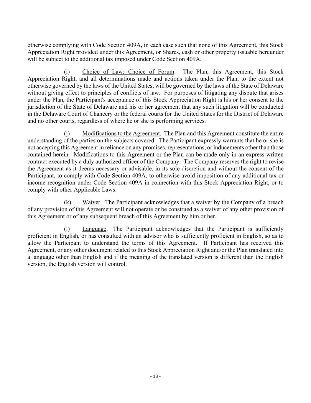 - 13 - otherwise complying with Code Section 409A, in each case such that none of this Agreement, this Stock Appreciation Right provided under this Agreement, or Shares, cash or other property issuable hereunder will be subject to the additional tax imposed under Code Section 409A. (i) Choice of Law; Choice of Forum. The Plan, this Agreement, this Stock Appreciation Right, and all determinations made and actions taken under the Plan, to the extent not otherwise governed by the laws of the United States, will be governed by the laws of the State of Delaware without giving effect to principles of conflicts of law. For purposes of litigating any dispute that arises under the Plan, the Participant's acceptance of this Stock Appreciation Right is his or her consent to the jurisdiction of the State of Delaware and his or her agreement that any such litigation will be conducted in the Delaware Court of Chancery or the federal courts for the United States for the District of Delaware and no other courts, regardless of where he or she is performing services. (j) Modifications to the Agreement. The Plan and this Agreement constitute the entire understanding of the parties on the subjects covered. The Participant expressly warrants that he or she is not accepting this Agreement in reliance on any promises, representations, or inducements other than those contained herein. Modifications to this Agreement or the Plan can be made only in an express written contract executed by a duly authorized officer of the Company. The Company reserves the right to revise the Agreement as it deems necessary or advisable, in its sole discretion and without the consent of the Participant, to comply with Code Section 409A, to otherwise avoid imposition of any additional tax or income recognition under Code Section 409A in connection with this Stock Appreciation Right, or to comply with other Applicable Laws. (k) Waiver. The Participant acknowledges that a waiver by the Company of a breach of any provision of this Agreement will not operate or be construed as a waiver of any other provision of this Agreement or of any subsequent breach of this Agreement by him or her. (l) Language. The Participant acknowledges that the Participant is sufficiently proficient in English, or has consulted with an advisor who is sufficiently proficient in English, so as to allow the Participant to understand the terms of this Agreement. If Participant has received this Agreement, or any other document related to this Stock Appreciation Right and/or the Plan translated into a language other than English and if the meaning of the translated version is different than the English version, the English version will control.
