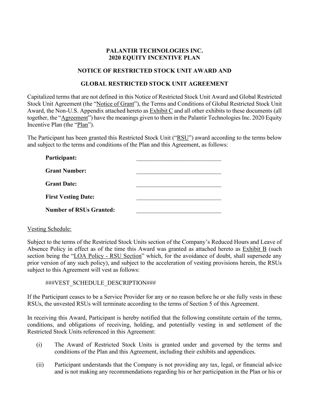 PALANTIR TECHNOLOGIES INC. 2020 EQUITY INCENTIVE PLAN NOTICE OF RESTRICTED STOCK UNIT AWARD AND GLOBAL RESTRICTED STOCK UNIT AGREEMENT Capitalized terms that are not defined in this Notice of Restricted Stock Unit Award and Global Restricted Stock Unit Agreement (the “Notice of Grant”), the Terms and Conditions of Global Restricted Stock Unit Award, the Non-U.S. Appendix attached hereto as Exhibit C and all other exhibits to these documents (all together, the “Agreement”) have the meanings given to them in the Palantir Technologies Inc. 2020 Equity Incentive Plan (the “Plan”). The Participant has been granted this Restricted Stock Unit (“RSU”) award according to the terms below and subject to the terms and conditions of the Plan and this Agreement, as follows: Participant: ____________________________ Grant Number: ____________________________ Grant Date: ____________________________ First Vesting Date: ____________________________ Number of RSUs Granted: ____________________________ Vesting Schedule: Subject to the terms of the Restricted Stock Units section of the Company’s Reduced Hours and Leave of Absence Policy in effect as of the time this Award was granted as attached hereto as Exhibit B (such section being the “LOA Policy - RSU Section” which, for the avoidance of doubt, shall supersede any prior version of any such policy), and subject to the acceleration of vesting provisions herein, the RSUs subject to this Agreement will vest as follows: ###VEST_SCHEDULE_DESCRIPTION### If the Participant ceases to be a Service Provider for any or no reason before he or she fully vests in these RSUs, the unvested RSUs will terminate according to the terms of Section 5 of this Agreement. In receiving this Award, Participant is hereby notified that the following constitute certain of the terms, conditions, and obligations of receiving, holding, and potentially vesting in and settlement of the Restricted Stock Units referenced in this Agreement: (i) The Award of Restricted Stock Units is granted under and governed by the terms and conditions of the Plan and this Agreement, including their exhibits and appendices. (ii) Participant understands that the Company is not providing any tax, legal, or financial advice and is not making any recommendations regarding his or her participation in the Plan or his or