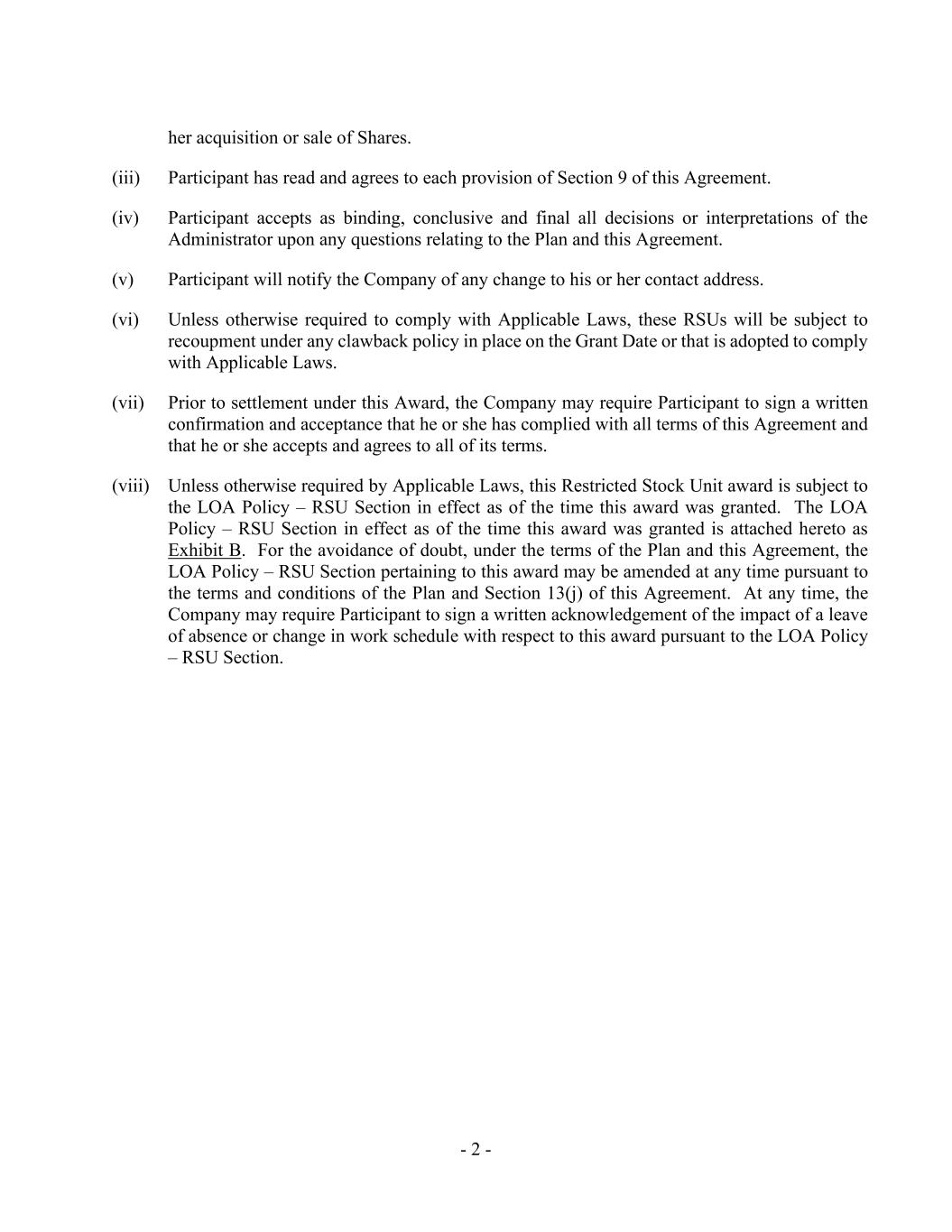 - 2 - her acquisition or sale of Shares. (iii) Participant has read and agrees to each provision of Section 9 of this Agreement. (iv) Participant accepts as binding, conclusive and final all decisions or interpretations of the Administrator upon any questions relating to the Plan and this Agreement. (v) Participant will notify the Company of any change to his or her contact address. (vi) Unless otherwise required to comply with Applicable Laws, these RSUs will be subject to recoupment under any clawback policy in place on the Grant Date or that is adopted to comply with Applicable Laws. (vii) Prior to settlement under this Award, the Company may require Participant to sign a written confirmation and acceptance that he or she has complied with all terms of this Agreement and that he or she accepts and agrees to all of its terms. (viii) Unless otherwise required by Applicable Laws, this Restricted Stock Unit award is subject to the LOA Policy – RSU Section in effect as of the time this award was granted. The LOA Policy – RSU Section in effect as of the time this award was granted is attached hereto as Exhibit B. For the avoidance of doubt, under the terms of the Plan and this Agreement, the LOA Policy – RSU Section pertaining to this award may be amended at any time pursuant to the terms and conditions of the Plan and Section 13(j) of this Agreement. At any time, the Company may require Participant to sign a written acknowledgement of the impact of a leave of absence or change in work schedule with respect to this award pursuant to the LOA Policy – RSU Section.